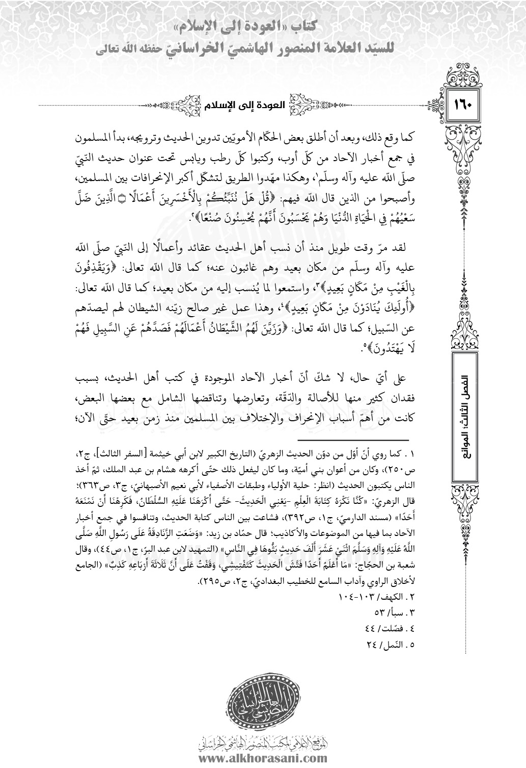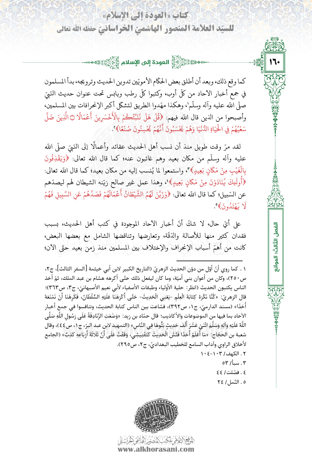 لقد مرّ وقت طويل منذ أن نسب أهل الحديث عقائد وأعمالًا إلى النّبيّ صلّى اللّه عليه وآله وسلّم من مكان بعيد وهم غائبون عنه؛ كما قال اللّه تعالى: ﴿وَيَقْذِفُونَ بِالْغَيْبِ مِنْ مَكَانٍ بَعِيدٍ[٣]، واستمعوا لما يُنسب إليه من مكان بعيد؛ كما قال اللّه تعالى: ﴿أُولَئِكَ يُنَادَوْنَ مِنْ مَكَانٍ بَعِيدٍ[٤]، وهذا عمل غير صالح زيّنه الشيطان لهم ليصدّهم عن السّبيل؛ كما قال اللّه تعالى: ﴿وَزَيَّنَ لَهُمُ الشَّيْطَانُ أَعْمَالَهُمْ فَصَدَّهُمْ عَنِ السَّبِيلِ فَهُمْ لَا يَهْتَدُونَ[٥].