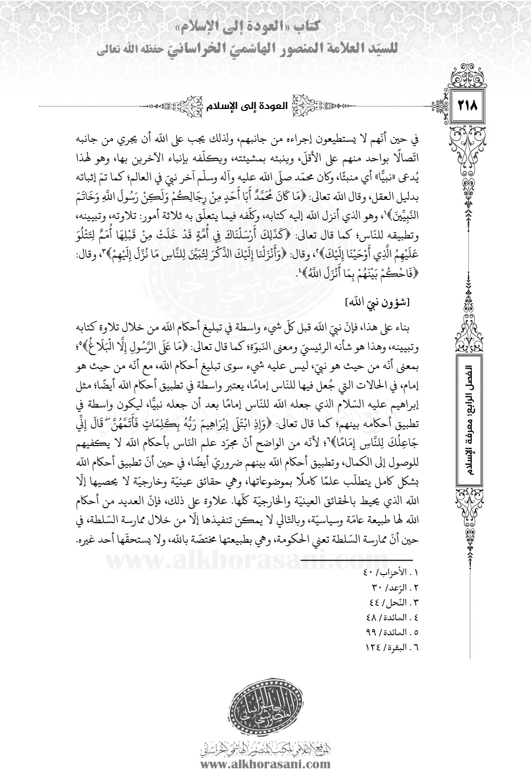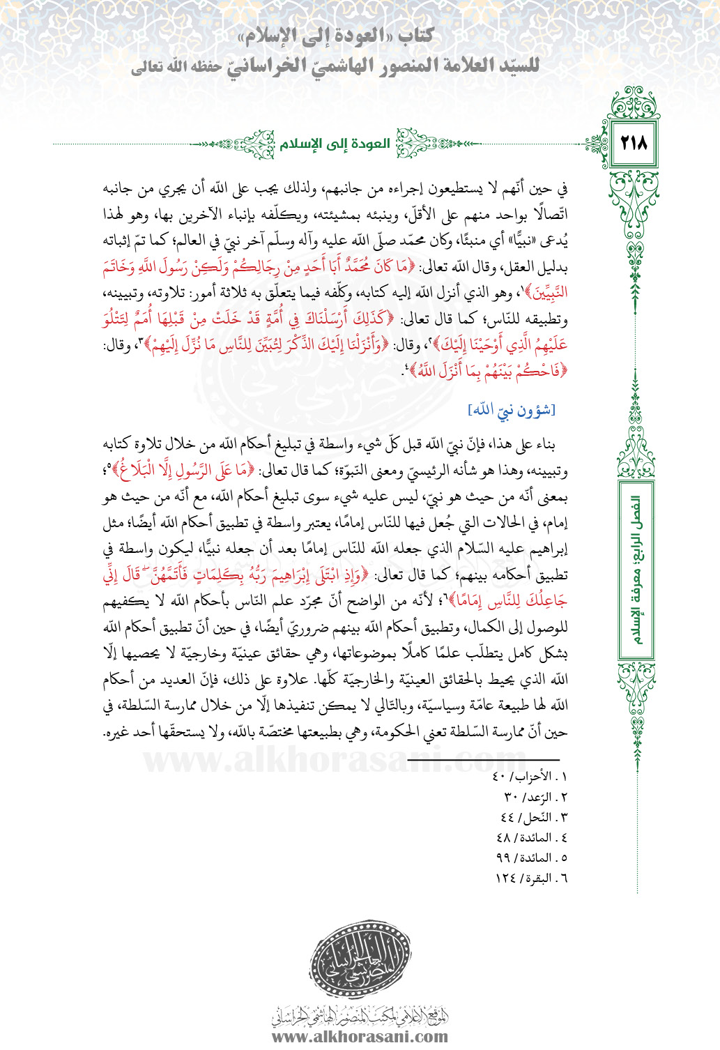 في حين أنّهم لا يستطيعون إجراءه من جانبهم، ولذلك يجب على اللّه أن يجري من جانبه اتّصالًا بواحد منهم على الأقلّ، وينبئه بمشيئته، ويكلّفه بإنباء الآخرين بها، وهو لهذا يُدعى «نبيًّا» أي منبئًا، وكان محمّد صلّى اللّه عليه وآله وسلّم آخر نبيّ في العالم؛ كما تمّ إثباته بدليل العقل، وقال اللّه تعالى: ﴿مَا كَانَ مُحَمَّدٌ أَبَا أَحَدٍ مِنْ رِجَالِكُمْ وَلَكِنْ رَسُولَ اللَّهِ وَخَاتَمَ النَّبِيِّينَ[١]، وهو الذي أنزل اللّه إليه كتابه، وكلّفه فيما يتعلّق به ثلاثة أمور: تلاوته، وتبيينه، وتطبيقه للنّاس؛ كما قال تعالى: ﴿كَذَلِكَ أَرْسَلْنَاكَ فِي أُمَّةٍ قَدْ خَلَتْ مِنْ قَبْلِهَا أُمَمٌ لِتَتْلُوَ عَلَيْهِمُ الَّذِي أَوْحَيْنَا إِلَيْكَ[٢]، وقال: ﴿وَأَنْزَلْنَا إِلَيْكَ الذِّكْرَ لِتُبَيِّنَ لِلنَّاسِ مَا نُزِّلَ إِلَيْهِمْ[٣]، وقال: ﴿فَاحْكُمْ بَيْنَهُمْ بِمَا أَنْزَلَ اللَّهُ[٤].