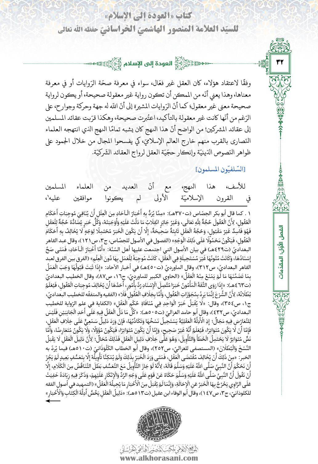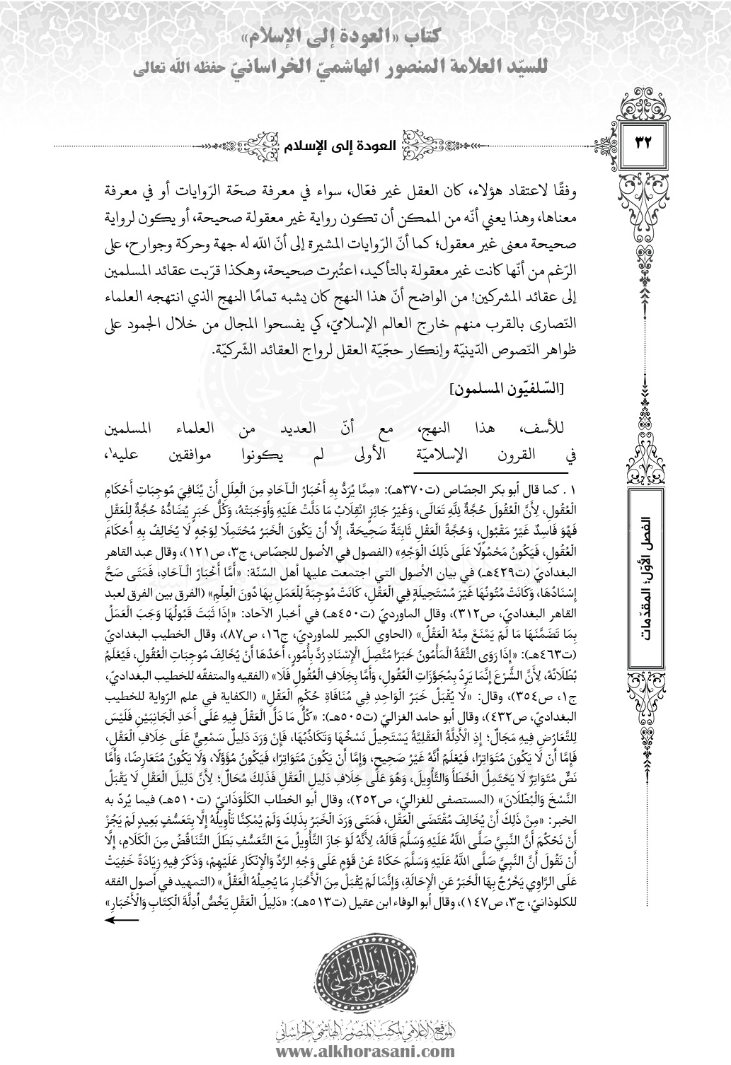 ↑[١] . كما قال أبو بكر الجصّاص (ت٣٧٠هـ): «مِمَّا يُرَدُّ بِهِ أَخْبَارُ الْآحَادِ مِنَ الْعِلَلِ أَنْ يُنَافِيَ مُوجِبَاتِ أَحْكَامِ الْعُقُولِ، لِأَنَّ الْعُقُولَ حُجَّةٌ لِلَّهِ تَعَالَى، وَغَيْرُ جَائِزٍ انْقِلَابُ مَا دَلَّتْ عَلَيْهِ وَأَوْجَبَتْهُ، وَكُلُّ خَبَرٍ يُضَادُّهُ حُجَّةٌ لِلْعَقْلِ فَهُوَ فَاسِدٌ غَيْرُ مَقْبُولٍ، وَحُجَّةُ الْعَقْلِ ثَابِتَةٌ صَحِيحَةٌ، إِلَّا أَنْ يَكُونَ الْخَبَرُ مُحْتَمِلًا لِوَجْهٍ لَا يُخَالِفُ بِهِ أَحْكَامَ الْعُقُولِ، فَيَكُونُ مَحْمُولًا عَلَى ذَلِكَ الْوَجْهِ» (الفصول في الأصول للجصّاص، ج٣، ص١٢١)، وقال عبد القاهر البغداديّ (ت٤٢٩هـ) في بيان الأصول التي اجتمعت عليها أهل السّنّة: «أَمَّا أَخْبَارُ الْآحَادِ، فَمَتَى صَحَّ إِسْنَادُهَا، وَكَانَتْ مُتُونُهَا غَيْرَ مُسْتَحِيلَةٍ فِي الْعَقْلِ، كَانَتْ مُوجِبَةً لِلْعَمَلِ بِهَا دُونَ الْعِلْمِ» (الفرق بين الفرق لعبد القاهر البغداديّ، ص٣١٢)، وقال الماورديّ (ت٤٥٠هـ) في أخبار الآحاد: «إِذَا ثَبَتَ قَبُولُهَا وَجَبَ الْعَمَلُ بِمَا تَضَمَّنَهَا مَا لَمْ يَمْنَعْ مِنْهُ الْعَقْلُ» (الحاوي الكبير للماورديّ، ج١٦، ص٨٧)، وقال الخطيب البغداديّ (ت٤٦٣هـ): «إِذَا رَوَى الثِّقَةُ الْمَأْمُونُ خَبَرًا مُتَّصِلَ الْإِسْنَادِ رُدَّ بِأُمُورٍ، أَحَدُهَا أَنْ يُخَالِفَ مُوجِبَاتِ الْعُقُولِ، فَيُعْلَمُ بُطْلَانُهُ، لِأَنَّ الشَّرْعَ إِنَّمَا يَرِدُ بِمُجَوَّزَاتِ الْعُقُولِ، وَأَمَّا بِخِلَافِ الْعُقُولِ فَلَا» (الفقيه والمتفقّه للخطيب البغداديّ، ج١، ص٣٥٤)، وقال: «لَا يُقْبَلُ خَبَرُ الْوَاحِدِ فِي مُنَافَاةِ حُكْمِ الْعَقْلِ» (الكفاية في علم الرّواية للخطيب البغداديّ، ص٤٣٢)، وقال أبو حامد الغزاليّ (ت٥٠٥هـ): «كُلُّ مَا دَلَّ الْعَقْلُ فِيهِ عَلَى أَحَدِ الْجَانِبَيْنِ فَلَيْسَ لِلتَّعَارُضِ فِيهِ مَجَالٌ؛ إِذِ الْأَدِلَّةُ الْعَقْلِيَّةُ يَسْتَحِيلُ نَسْخُهَا وَتَكَاذُبُهَا، فَإِنْ وَرَدَ دَلِيلٌ سَمْعِيٌّ عَلَى خِلَافِ الْعَقْلِ، فَإِمَّا أَنْ لَا يَكُونَ مُتَوَاتِرًا، فَيُعْلَمُ أَنَّهُ غَيْرُ صَحِيحٍ، وَإِمَّا أَنْ يَكُونَ مُتَوَاتِرًا، فَيَكُونُ مُؤَوَّلًا، وَلَا يَكُونُ مُتَعَارِضًا، وَأَمَّا نَصٌّ مُتَوَاتِرٌ لَا يَحْتَمِلُ الْخَطَأَ وَالتَّأْوِيلَ، وَهُوَ عَلَى خِلَافِ دَلِيلِ الْعَقْلِ فَذَلِكَ مُحَالٌ؛ لِأَنَّ دَلِيلَ الْعَقْلِ لَا يَقْبَلُ النَّسْخَ وَالْبُطْلَانَ» (المستصفى للغزاليّ، ص٢٥٢)، وقال أبو الخطاب الكَلْوَذَانيّ (ت٥١٠هـ) فيما يُردّ به الخبر: «مِنْ ذَلِكَ أَنْ يُخَالِفَ مُقْتَضَى الْعَقْلِ، فَمَتَى وَرَدَ الْخَبَرُ بِذَلِكَ وَلَمْ يُمْكِنَّا تَأْوِيلُهُ إِلَّا بِتَعَسُّفٍ بَعِيدٍ لَمْ يَجُزْ أَنْ نَحْكُمَ أَنَّ النَّبِيَّ صَلَّى اللَّهُ عَلَيْهِ وَسَلَّمَ قَالَهُ، لِأَنَّهُ لَوْ جَازَ التَّأْوِيلُ مَعَ التَّعَسُّفِ بَطَلَ التَّنَاقُضُ مِنَ الْكَلَامِ، إِلَّا أَنْ نَقُولَ أَنَّ النَّبِيَّ صَلَّى اللَّهُ عَلَيْهِ وَسَلَّمَ حَكَاهُ عَنْ قَوْمٍ عَلَى وَجْهِ الرَّدِّ وَالْإِنْكَارِ عَلَيْهِمْ، وَذَكَرَ فِيهِ زِيَادَةً خَفِيَتْ عَلَى الرَّاوِي يَخْرُجُ بِهَا الْخَبَرُ عَنِ الْإِحَالَةِ، وَإِنَّمَا لَمْ يُقْبَلْ مِنَ الْأَخْبَارِ مَا يُحِيلُهُ الْعَقْلُ» (التمهيد في أصول الفقه للكلوذانيّ، ج٣، ص١٤٧)، وقال أبو الوفاء ابن عقيل (ت٥١٣هـ): «دَلِيلُ الْعَقْلِ يَخُصُّ أَدِلَّةَ الْكِتَابِ وَالْأَخْبَارِ» ←