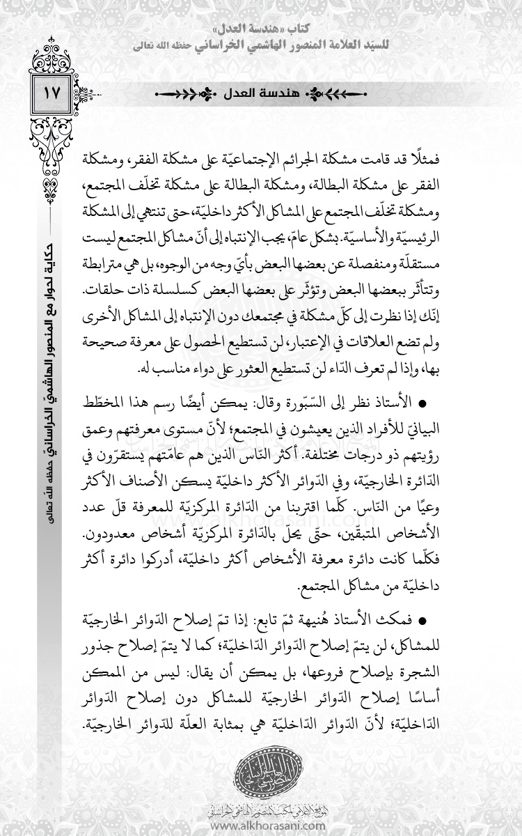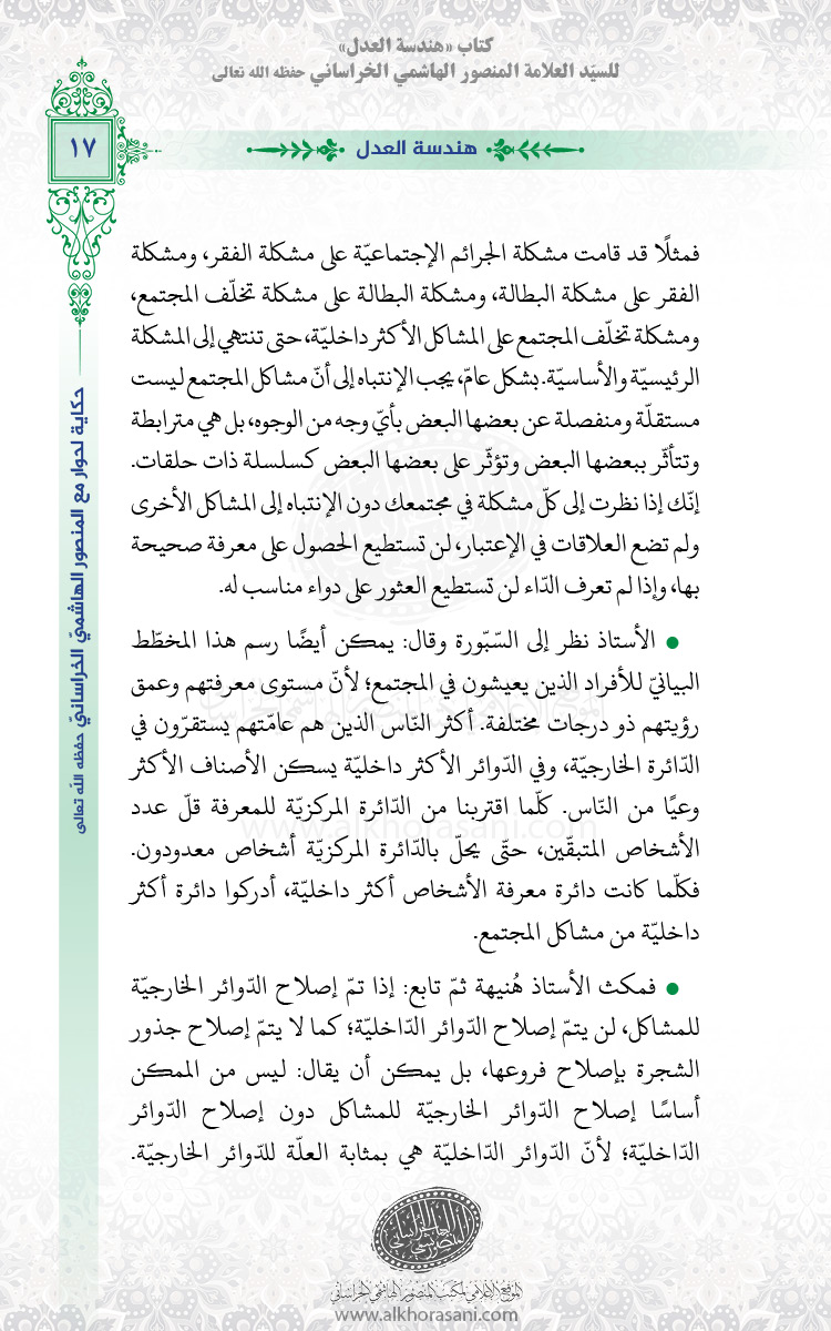 ● فمكث الأستاذ هُنيهة ثمّ تابع: إذا تمّ إصلاح الدّوائر الخارجيّة للمشاكل، لم يتمّ إصلاح الدّوائر الدّاخليّة؛ كما لا يتمّ إصلاح جذور الشجرة بإصلاح فروعها، بل يمكن أن يقال: ليس من الممكن أساسًا إصلاح الدّوائر الخارجيّة للمشاكل دون إصلاح الدّوائر الدّاخليّة؛ لأنّ الدّوائر الدّاخليّة هي بمثابة العلّة للدّوائر الخارجيّة.