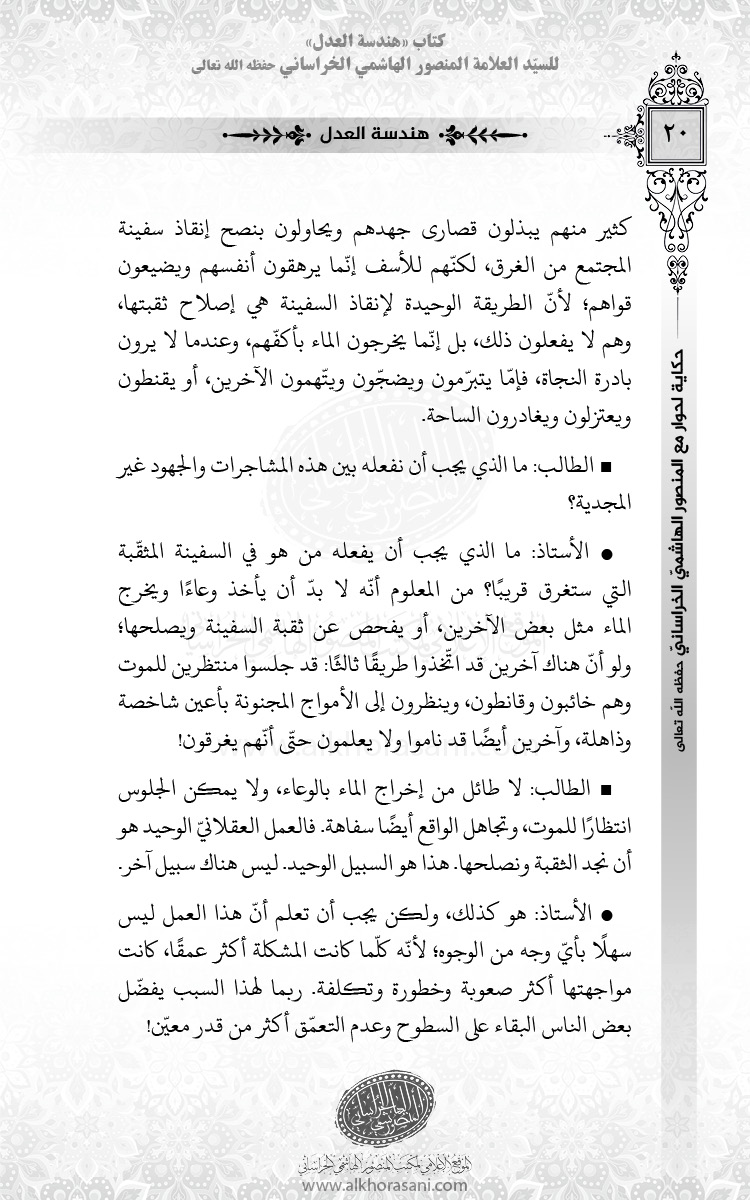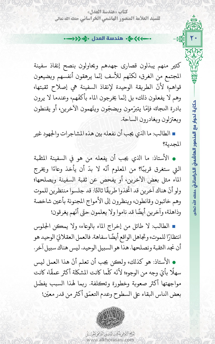 الأستاذ: ماذا يجب أن يفعله من هو في السفينة المثقّبة التي ستغرق قريبًا؟ من المعلوم أنّه لا بدّ أن يأخذ وعاءًا ويخرج الماء مثل بعض الآخرين، أو يفحص عن ثقبة السفينة ويصلحها؛ ولو أنّ هناك آخرين قد اتّخذوا طريقًا ثالثًا: قد جلسوا منتظرين للموت وهم خائبون وقانطون، وينظرون إلى الأمواج المجنونة بأعين شاخصة وذاهلة، وآخرين أيضًا قد ناموا ولا يعلمون حتّى أنّهم يغرقون!