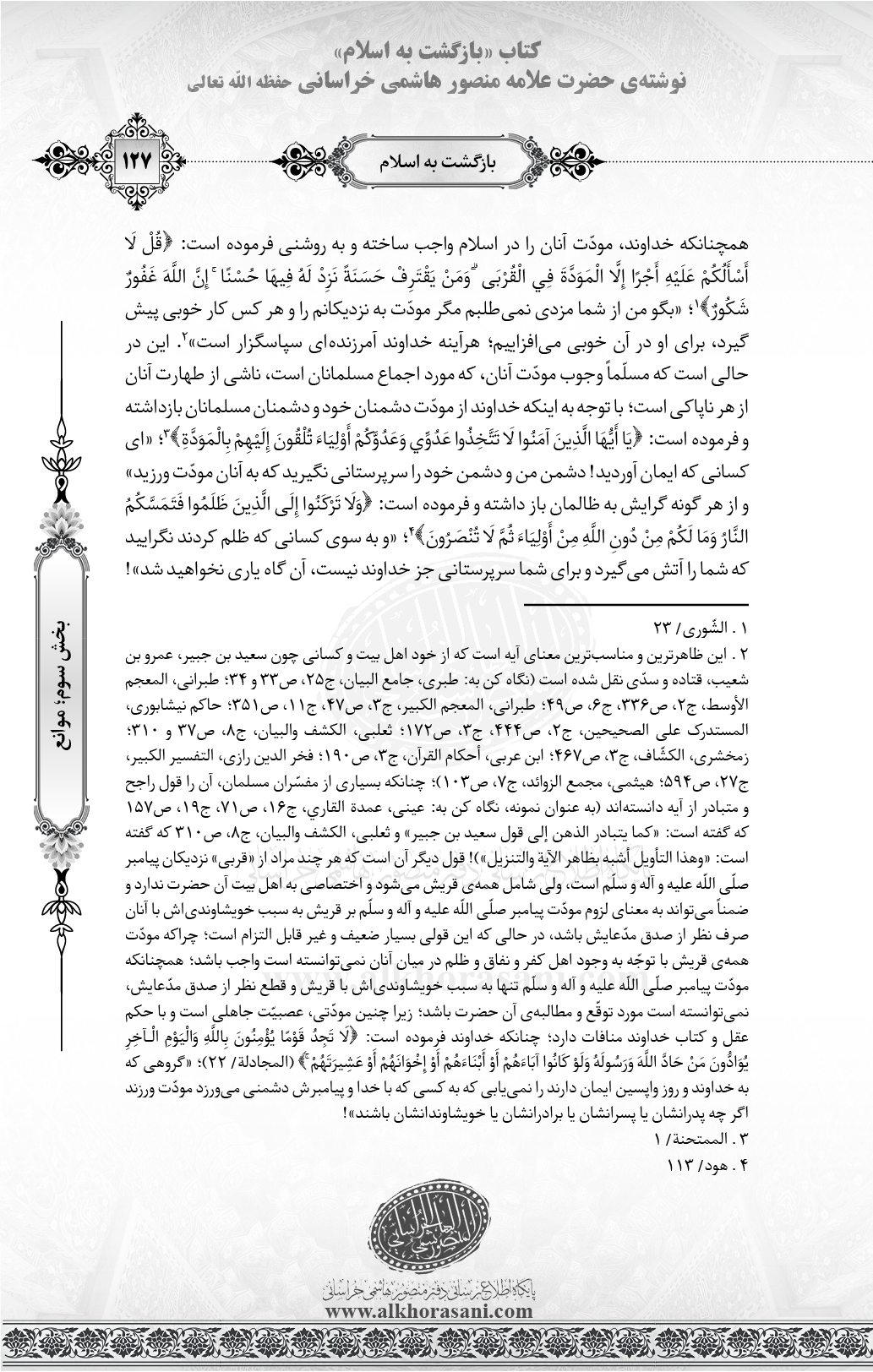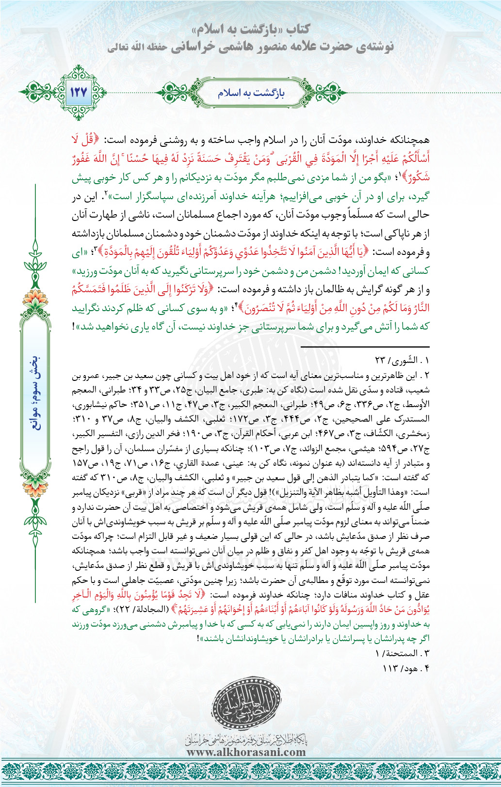 ↑[۲] . این ظاهرترین و مناسب‌ترین معنای آیه است که از خود اهل بیت و کسانی چون سعید بن جبیر، عمرو بن شعیب، قتاده و سدّی نقل شده است (نگاه کن به: طبری، جامع البیان، ج۲۵، ص۳۳ و ۳۴؛ طبرانی، المعجم الأوسط، ج۲، ص۳۳۶، ج۶، ص۴۹؛ طبرانی، المعجم الکبیر، ج۳، ص۴۷، ج۱۱، ص۳۵۱؛ حاکم نیشابوری، المستدرک علی الصحیحین، ج۲، ص۴۴۴، ج۳، ص۱۷۲؛ ثعلبی، الکشف والبیان، ج۸، ص۳۷ و ۳۱۰؛ زمخشری، الکشّاف، ج۳، ص۴۶۷؛ ابن عربی، أحکام القرآن، ج۳، ص۱۹۰؛ فخر الدین رازی، التفسیر الکبیر، ج۲۷، ص۵۹۴؛ هیثمی، مجمع الزوائد، ج۷، ص۱۰۳)؛ چنانکه بسیاری از مفسّران مسلمان، آن را قول راجح و متبادر از آیه دانسته‌اند (به عنوان نمونه، نگاه کن به: عینی، عمدة القاري، ج۱۶، ص۷۱، ج۱۹، ص۱۵۷ که گفته است: «كما يتبادر الذهن إلى قول سعيد بن جبير» و ثعلبی، الکشف والبیان، ج۸، ص۳۱۰ که گفته است: «وهذا التأويل أشبه بظاهر الآية والتنزيل»)! قول دیگر آن است که هر چند مراد از «قربی» نزدیکان پیامبر (صلّی الله علیه و آله و سلّم) است، ولی شامل همه‌ی قریش می‌شود و اختصاصی به اهل بیت آن حضرت ندارد و ضمناً می‌تواند به معنای لزوم مودّت پیامبر (صلّی الله علیه و آله و سلّم) بر قریش به سبب خویشاوندی‌اش با آنان صرف نظر از صدق مدّعایش باشد، در حالی که این قولی بسیار ضعیف و غیر قابل التزام است؛ چراکه مودّت همه‌ی قریش با توجّه به وجود اهل کفر و نفاق و ظلم در میان آنان نمی‌توانسته است واجب باشد؛ همچنانکه مودّت پیامبر (صلّی الله علیه و آله و سلّم) تنها به سبب خویشاوندی‌اش با قریش و قطع نظر از صدق مدّعایش، نمی‌توانسته است مورد توقّع و مطالبه‌ی آن حضرت باشد؛ زیرا چنین مودّتی، عصبیّت جاهلی است و با حکم عقل و کتاب خداوند منافات دارد؛ چنانکه خداوند فرموده است: ﴿لَا تَجِدُ قَوْمًا يُؤْمِنُونَ بِاللَّهِ وَالْيَوْمِ الْآخِرِ يُوَادُّونَ مَنْ حَادَّ اللَّهَ وَرَسُولَهُ وَلَوْ كَانُوا آبَاءَهُمْ أَوْ أَبْنَاءَهُمْ أَوْ إِخْوَانَهُمْ أَوْ عَشِيرَتَهُمْ﴾ (المجادلة/ ۲۲)؛ «گروهی که به خداوند و روز واپسین ایمان دارند را نمی‌یابی که به کسی که با خدا و پیامبرش دشمنی می‌ورزد مودّت ورزند اگر چه پدرانشان یا پسرانشان یا برادرانشان یا خویشاوندانشان باشند»!