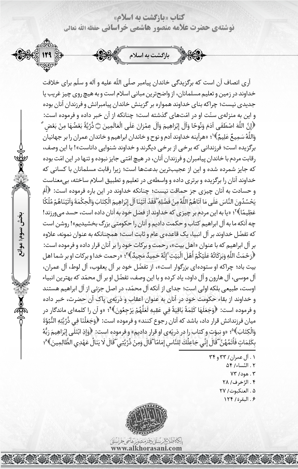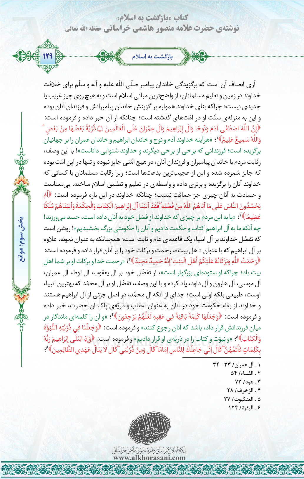 آری انصاف آن است که برگزیدگی خاندان پیامبر (صلّی الله علیه و آله و سلّم) برای خلافت خداوند در زمین و تعلیم مسلمانان، از واضح‌ترین مبانی اسلام است و به هیچ روی چیز غریب یا جدیدی نیست؛ چراکه بنای خداوند همواره بر گزینش خاندان پیامبرانش و فرزندان آنان بوده و این به منزله‌ی سنّت او در امّت‌های گذشته است؛ چنانکه از آن خبر داده و فرموده است: ﴿إِنَّ اللَّهَ اصْطَفَى آدَمَ وَنُوحًا وَآلَ إِبْرَاهِيمَ وَآلَ عِمْرَانَ عَلَى الْعَالَمِينَ ۝ ذُرِّيَّةً بَعْضُهَا مِنْ بَعْضٍ ۗ وَاللَّهُ سَمِيعٌ عَلِيمٌ﴾[۱]؛ «هرآینه خداوند آدم و نوح و خاندان ابراهیم و خاندان عمران را بر جهانیان برگزیده است؛ فرزندانی که برخی از برخی دیگرند و خداوند شنوایی داناست»! با این وصف، رقابت مردم با خاندان پیامبران و فرزندان آنان، در هیچ امّتی جایز نبوده و تنها در این امّت بوده که جایز شمرده شده و این از عجیب‌ترین بدعت‌ها است؛ زیرا رقابت مسلمانان با کسانی که خداوند آنان را برگزیده و برتری داده و واسطه‌ی در تعلیم و تطبیق اسلام ساخته، بی‌معناست و حسادت به آنان چیزی جز حماقت نیست؛ چنانکه خداوند در این باره فرموده است: ﴿أَمْ يَحْسُدُونَ النَّاسَ عَلَى مَا آتَاهُمُ اللَّهُ مِنْ فَضْلِهِ ۖ فَقَدْ آتَيْنَا آلَ إِبْرَاهِيمَ الْكِتَابَ وَالْحِكْمَةَ وَآتَيْنَاهُمْ مُلْكًا عَظِيمًا﴾[۲]؛ «یا به این مردم بر چیزی که خداوند از فضل خود به آنان داده است، حسد می‌ورزند! چه آنکه ما به آل ابراهیم کتاب و حکمت دادیم و آنان را حکومتی بزرگ بخشیدیم»! روشن است که تفضّل خداوند بر آل انبیا، یک قاعده‌ی عام و ثابت است؛ همچنانکه به عنوان نمونه، علاوه بر آل ابراهیم که با عنوان «اهل بیت»، رحمت و برکات خود را بر آنان قرار داده و فرموده است: ﴿رَحْمَتُ اللَّهِ وَبَرَكَاتُهُ عَلَيْكُمْ أَهْلَ الْبَيْتِ ۚ إِنَّهُ حَمِيدٌ مَجِيدٌ﴾[۳]؛ «رحمت خدا و برکات او بر شما اهل بیت باد؛ چراکه او ستوده‌ای بزرگوار است»، از تفضّل خود بر آل یعقوب، آل لوط، آل عمران، آل موسی، آل هارون و آل داود، یاد کرده و با این وصف، تفضّل او بر آل محمّد که بهترین انبیاء اوست، طبیعی بلکه اولی است؛ جدای از آنکه آل محمّد، در اصل جزئی از آل ابراهیم هستند و خداوند از بقاء حکومت خود در آنان به عنوان اعقاب و ذریّه‌ی پاک آن حضرت، خبر داده و فرموده است: ﴿وَجَعَلَهَا كَلِمَةً بَاقِيَةً فِي عَقِبِهِ لَعَلَّهُمْ يَرْجِعُونَ﴾[۴]؛ «و آن را کلمه‌ای ماندگار در میان فرزندانش قرار داد، باشد که آنان رجوع کنند» و فرموده است: ﴿وَجَعَلْنَا فِي ذُرِّيَّتِهِ النُّبُوَّةَ وَالْكِتَابَ﴾[۵]؛ «و نبوّت و کتاب را در ذریّه‌ی او قرار دادیم» و فرموده است: ﴿وَإِذِ ابْتَلَى إِبْرَاهِيمَ رَبُّهُ بِكَلِمَاتٍ فَأَتَمَّهُنَّ ۖ قَالَ إِنِّي جَاعِلُكَ لِلنَّاسِ إِمَامًا ۖ قَالَ وَمِنْ ذُرِّيَّتِي ۖ قَالَ لَا يَنَالُ عَهْدِي الظَّالِمِينَ﴾[۶]؛