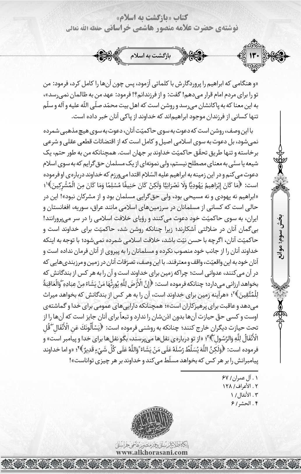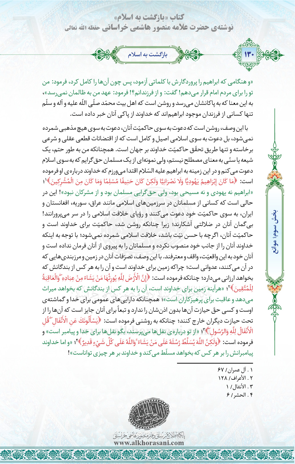 با این وصف، روشن است که دعوت به سوی حاکمیّت آنان، دعوت به سوی هیچ مذهبی شمرده نمی‌شود، بل دعوت به سوی اسلامی اصیل و کامل است که از اقتضائات قطعی عقلی و شرعی برخاسته و تنها طریق تحقّق حاکمیّت خداوند بر جهان است. همچنانکه من به طور حتم، یک شیعه یا سنّی به معنای مصطلح نیستم، ولی نمونه‌ای از یک مسلمان حق‌گرایم که به سوی اسلام دعوت می‌کنم و در این زمینه به ابراهیم (علیه السلام) اقتدا می‌ورزم که خداوند درباره‌ی او فرموده است: ﴿مَا كَانَ إِبْرَاهِيمُ يَهُودِيًّا وَلَا نَصْرَانِيًّا وَلَكِنْ كَانَ حَنِيفًا مُسْلِمًا وَمَا كَانَ مِنَ الْمُشْرِكِينَ﴾[۱]؛ «ابراهیم نه یهودی و نه مسیحی بود، ولی حق‌گرایی مسلمان بود و از مشرکان نبود»! این در حالی است که کسانی از مسلمانان در سرزمین‌های اسلامی مانند عراق، سوریه، افغانستان و ایران، به سوی حاکمیّت خود دعوت می‌کنند و رؤیای خلافت اسلامی را در سر می‌پرورانند! بی‌گمان آنان در ضلالتی آشکارند؛ زیرا چنانکه روشن شد، حاکمیّت برای خداوند است و حاکمیّت آنان، اگرچه با حسن نیّت باشد، خلافت اسلامی شمرده نمی‌شود؛ با توجه به اینکه خداوند آنان را از جانب خود منصوب نکرده و مسلمانان را به پیروی از آنان فرمان نداده است و آنان خود به این واقعیّت، واقف و معترفند. با این وصف، تصرّفات آنان در زمین و مرزبندی‌هایی که در آن می‌کنند، عدوانی است؛ چراکه زمین برای خداوند است و آن را به هر کس از بندگانش که بخواهد ارزانی می‌دارد؛ چنانکه فرموده است: ﴿إِنَّ الْأَرْضَ لِلَّهِ يُورِثُهَا مَنْ يَشَاءُ مِنْ عِبَادِهِ ۖ وَالْعَاقِبَةُ لِلْمُتَّقِينَ﴾[۲]؛ «هرآینه زمین برای خداوند است، آن را به هر کس از بندگانش که بخواهد میراث می‌دهد و عاقبت برای پرهیزکاران است»؛ همچنانکه دارایی‌های عمومی برای خدا و گماشته‌ی اوست و کسی حقّ حیازت آن‌ها بدون اذن‌شان را ندارد و تبعاً برای آنان جایز است که آن‌ها را از تحت حیازت دیگران خارج کنند؛ چنانکه به روشنی فرموده است: ﴿يَسْأَلُونَكَ عَنِ الْأَنْفَالِ ۖ قُلِ الْأَنْفَالُ لِلَّهِ وَالرَّسُولِ﴾[۳]؛ «از تو درباره‌ی نفل‌ها می‌پرسند، بگو نفل‌ها برای خدا و پیامبر است» و فرموده است: ﴿وَلَكِنَّ اللَّهَ يُسَلِّطُ رُسُلَهُ عَلَى مَنْ يَشَاءُ ۚ وَاللَّهُ عَلَى كُلِّ شَيْءٍ قَدِيرٌ﴾[۴]؛ «و اما خداوند پیامبرانش را بر هر کس که بخواهد مسلّط می‌کند و خداوند بر هر چیزی تواناست»!