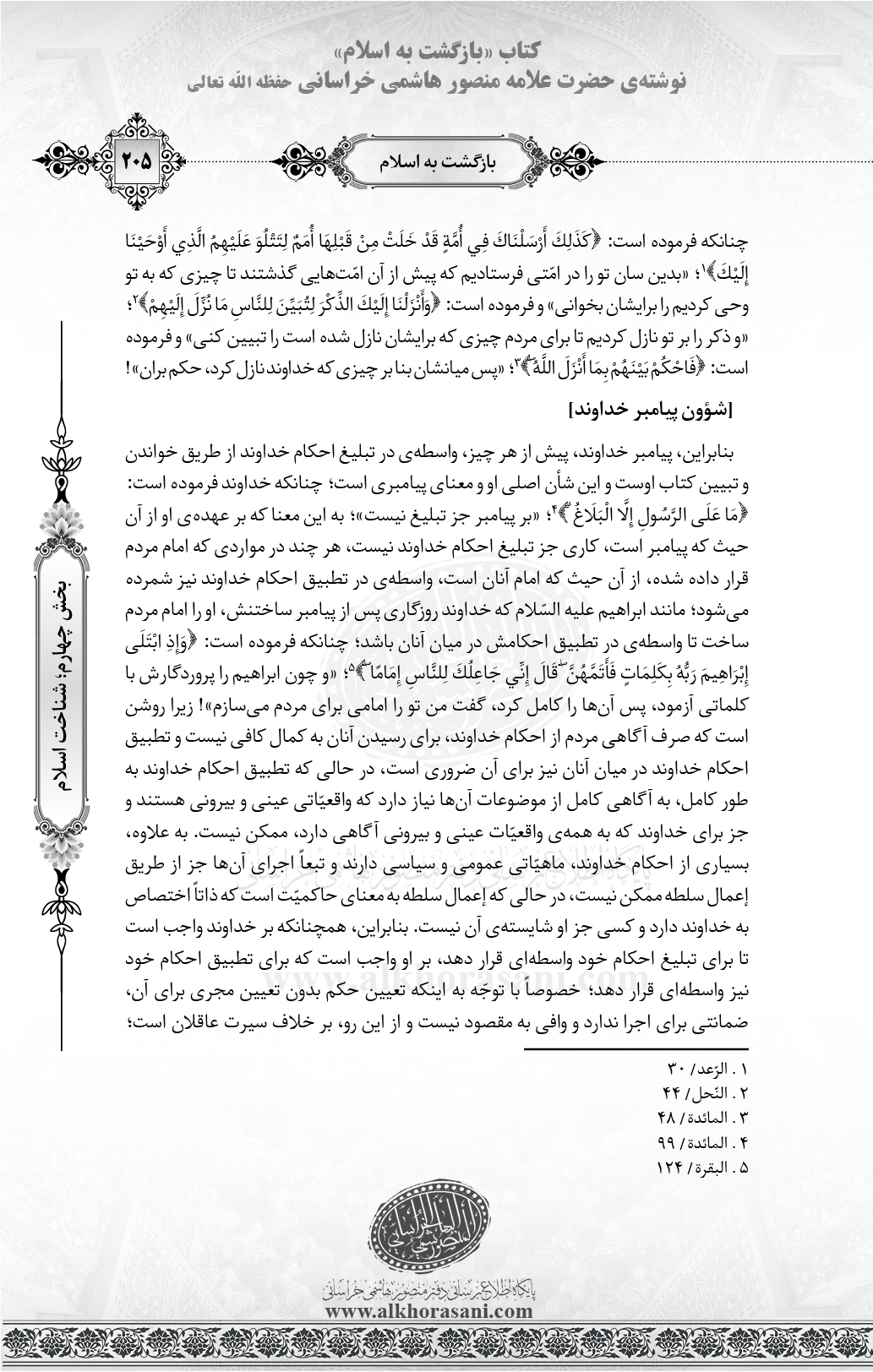 بنابراین، پیامبر خداوند، پیش از هر چیز، واسطه‌ی در تبلیغ احکام خداوند از طریق خواندن و تبیین کتاب اوست و این شأن اصلی او و معنای پیامبری است؛ چنانکه خداوند فرموده است: ﴿مَا عَلَى الرَّسُولِ إِلَّا الْبَلَاغُ﴾[۴]؛ «بر پیامبر جز تبلیغ نیست»؛ به این معنا که بر عهده‌ی او از آن حیث که پیامبر است، کاری جز تبلیغ احکام خداوند نیست، هر چند در مواردی که امام مردم قرار داده شده، از آن حیث که امام آنان است، واسطه‌ی در تطبیق احکام خداوند نیز شمرده می‌شود؛ مانند ابراهیم (علیه السلام) که خداوند روزگاری پس از پیامبر ساختنش، او را امام مردم ساخت تا واسطه‌ی در تطبیق احکامش در میان آنان باشد؛ چنانکه فرموده است: ﴿وَإِذِ ابْتَلَى إِبْرَاهِيمَ رَبُّهُ بِكَلِمَاتٍ فَأَتَمَّهُنَّ ۖ قَالَ إِنِّي جَاعِلُكَ لِلنَّاسِ إِمَامًا﴾[۵]؛ «و چون ابراهیم را پروردگارش با کلماتی آزمود، پس آن‌ها را کامل کرد، گفت من تو را امامی برای مردم می‌سازم»! زیرا روشن است که صرف آگاهی مردم از احکام خداوند، برای رسیدن آنان به کمال کافی نیست و تطبیق احکام خداوند در میان آنان نیز برای آن ضروری است، در حالی که تطبیق احکام خداوند به طور کامل، به آگاهی کامل از موضوعات آن‌ها نیاز دارد که واقعیّاتی عینی و بیرونی هستند و جز برای خداوند که به همه‌ی واقعیّات عینی و بیرونی آگاهی دارد، ممکن نیست. به علاوه، بسیاری از احکام خداوند، ماهیّاتی عمومی و سیاسی دارند و تبعاً اجرای آن‌ها جز از طریق إعمال سلطه ممکن نیست، در حالی که إعمال سلطه به معنای حاکمیّت است که ذاتاً اختصاص به خداوند دارد و کسی جز او شایسته‌ی آن نیست. بنابراین، همچنانکه بر خداوند واجب است تا برای تبلیغ احکام خود واسطه‌ای قرار دهد، بر او واجب است که برای تطبیق احکام خود نیز واسطه‌ای قرار دهد؛ خصوصاً با توجّه به اینکه تعیین حکم بدون تعیین مجری برای آن، ضمانتی برای اجرا ندارد و وافی به مقصود نیست و از این رو، بر خلاف سیرت عاقلان است؛