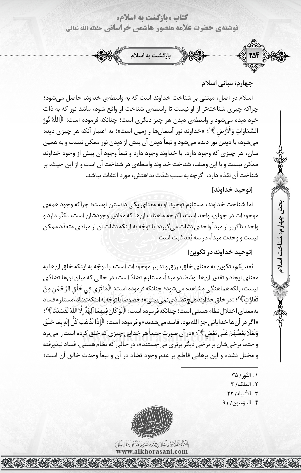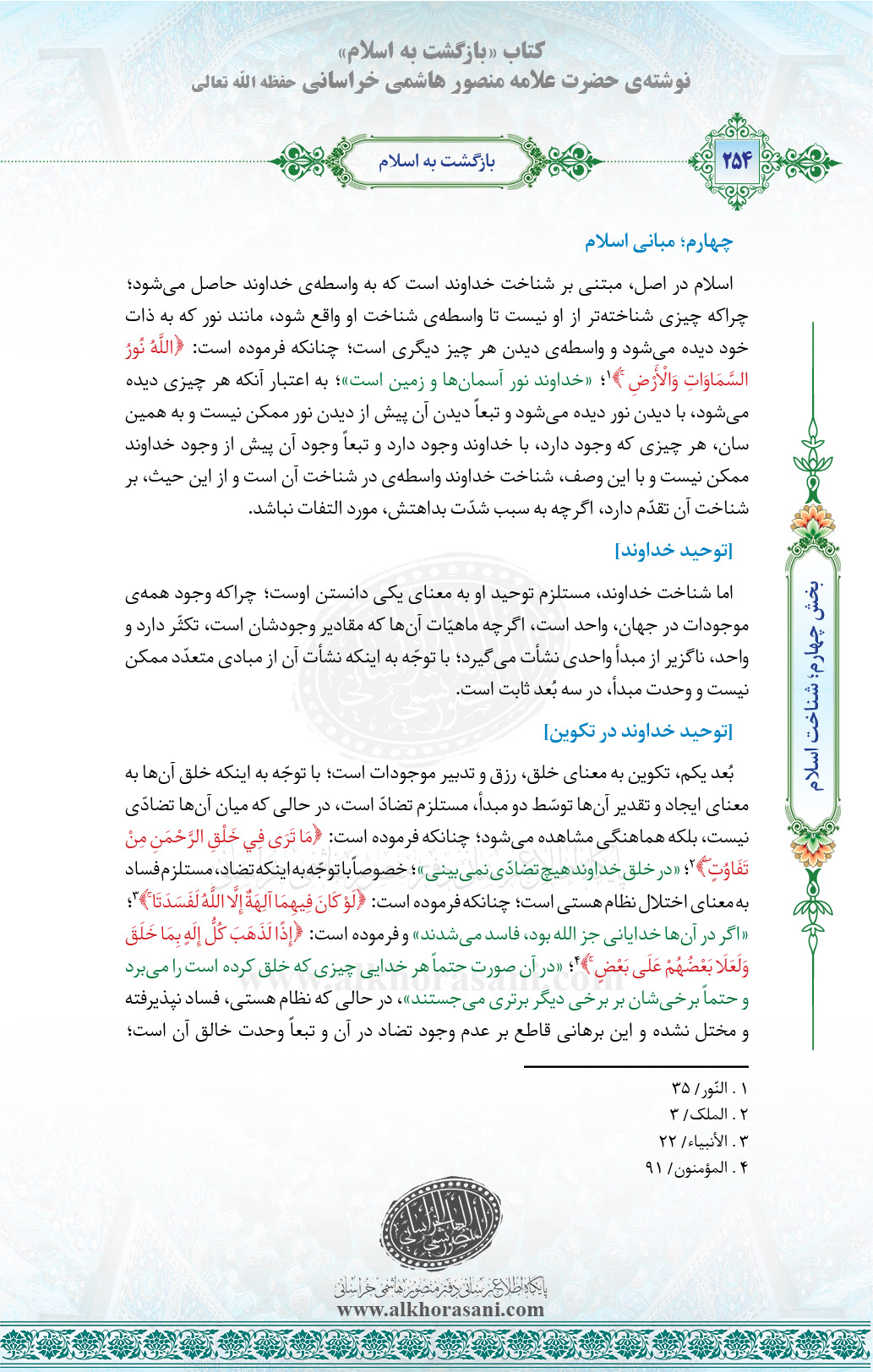 اسلام در اصل، مبتنی بر شناخت خداوند است که به واسطه‌ی خداوند حاصل می‌شود؛ چراکه چیزی شناخته‌تر از او نیست تا واسطه‌ی شناخت او واقع شود، مانند نور که به ذات خود دیده می‌شود و واسطه‌ی دیدن هر چیز دیگری است؛ چنانکه فرموده است: ﴿اللَّهُ نُورُ السَّمَاوَاتِ وَالْأَرْضِ﴾[۱]؛ «خداوند نور آسمان‌ها و زمین است»؛ به اعتبار آنکه هر چیزی دیده می‌شود، با دیدن نور دیده می‌شود و تبعاً دیدن آن پیش از دیدن نور ممکن نیست و به همین سان، هر چیزی که وجود دارد، با خداوند وجود دارد و تبعاً وجود آن پیش از وجود خداوند ممکن نیست و با این وصف، شناخت خداوند واسطه‌ی در شناخت آن است و از این حیث، بر شناخت آن تقدّم دارد، اگرچه به سبب شدّت بداهتش، مورد التفات نباشد.