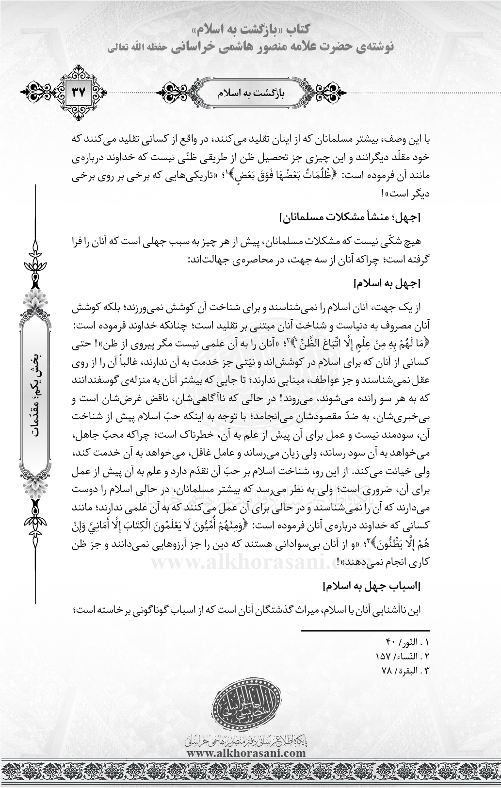 از یک جهت، آنان اسلام را نمی‌شناسند و برای شناخت آن کوشش نمی‌ورزند؛ بلکه کوشش آنان مصروف به دنیاست و شناخت آنان مبتنی بر تقلید است؛ چنانکه خداوند فرموده است: ﴿مَا لَهُمْ بِهِ مِنْ عِلْمٍ إِلَّا اتِّبَاعَ الظَّنِّ﴾[۲]؛ «آنان را به آن علمی نیست مگر پیروی از ظن»! حتی کسانی از آنان که برای اسلام در کوشش‌اند و نیّتی جز خدمت به آن ندارند، غالباً آن را از روی عقل نمی‌شناسند و جز عواطف، مبنایی ندارند؛ تا جایی که بیشتر آنان به منزله‌ی گوسفندانند که به هر سو رانده می‌شوند، می‌روند! در حالی که ناآگاهی‌شان، ناقض غرض‌شان است و بی‌خبری‌شان، به ضدّ مقصودشان می‌انجامد؛ با توجه به اینکه حبّ اسلام پیش از شناخت آن، سودمند نیست و عمل برای آن پیش از علم به آن، خطرناک است؛ چراکه محبّ جاهل، می‌خواهد به آن سود رساند، ولی زیان می‌رساند و عامل غافل، می‌خواهد به آن خدمت کند، ولی خیانت می‌کند. از این رو، شناخت اسلام بر حبّ آن تقدّم دارد و علم به آن پیش از عمل برای آن، ضروری است؛ ولی به نظر می‌رسد که بیشتر مسلمانان، در حالی اسلام را دوست می‌دارند که آن را نمی‌شناسند و در حالی برای آن عمل می‌کنند که به آن علمی ندارند؛ مانند کسانی که خداوند درباره‌ی آنان فرموده است: ﴿وَمِنْهُمْ أُمِّيُّونَ لَا يَعْلَمُونَ الْكِتَابَ إِلَّا أَمَانِيَّ وَإِنْ هُمْ إِلَّا يَظُنُّونَ﴾[۳]؛ «و از آنان بی‌سوادانی هستند که دین را جز آرزوهایی نمی‌دانند و جز ظن کاری انجام نمی‌دهند»!