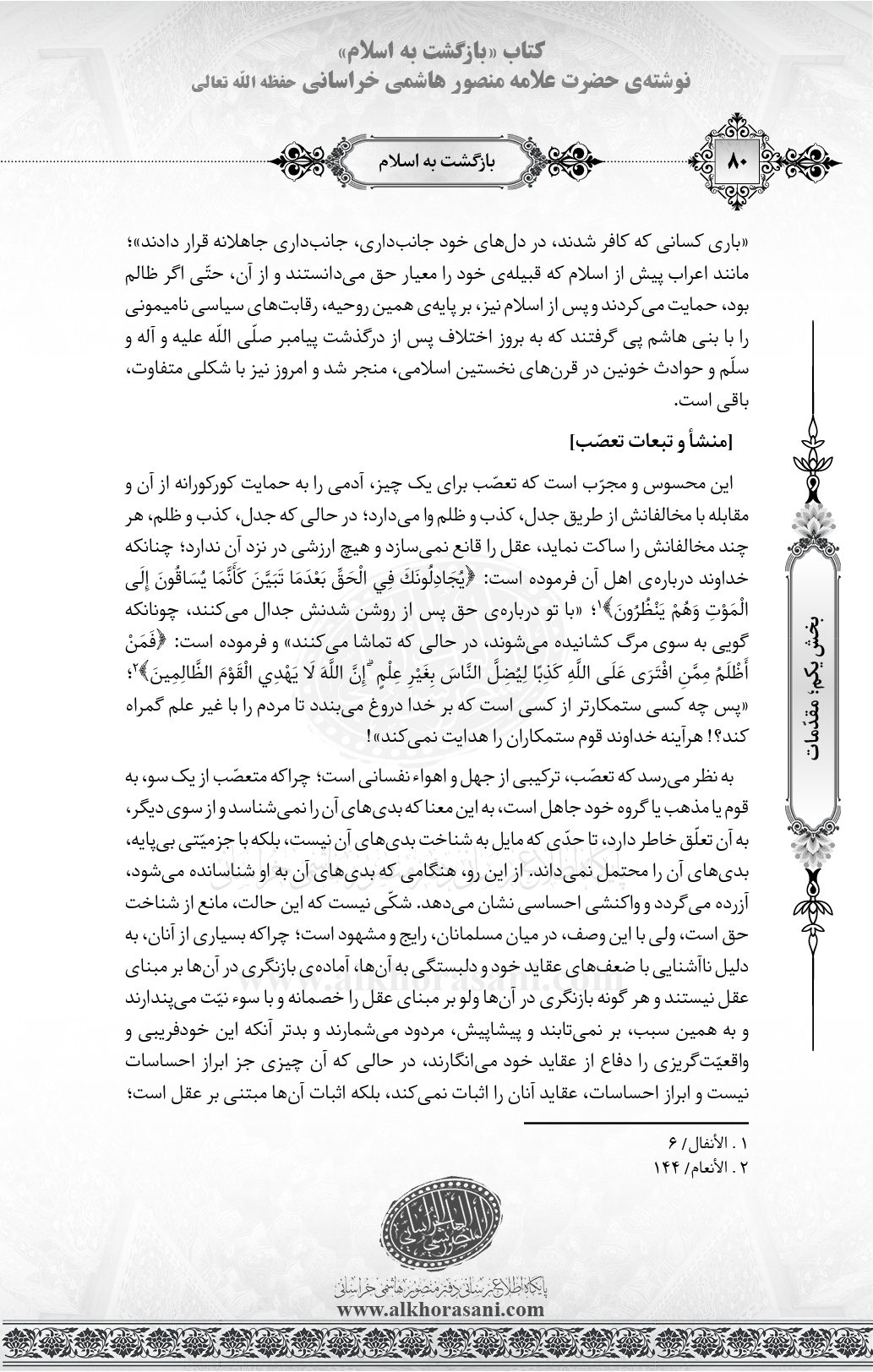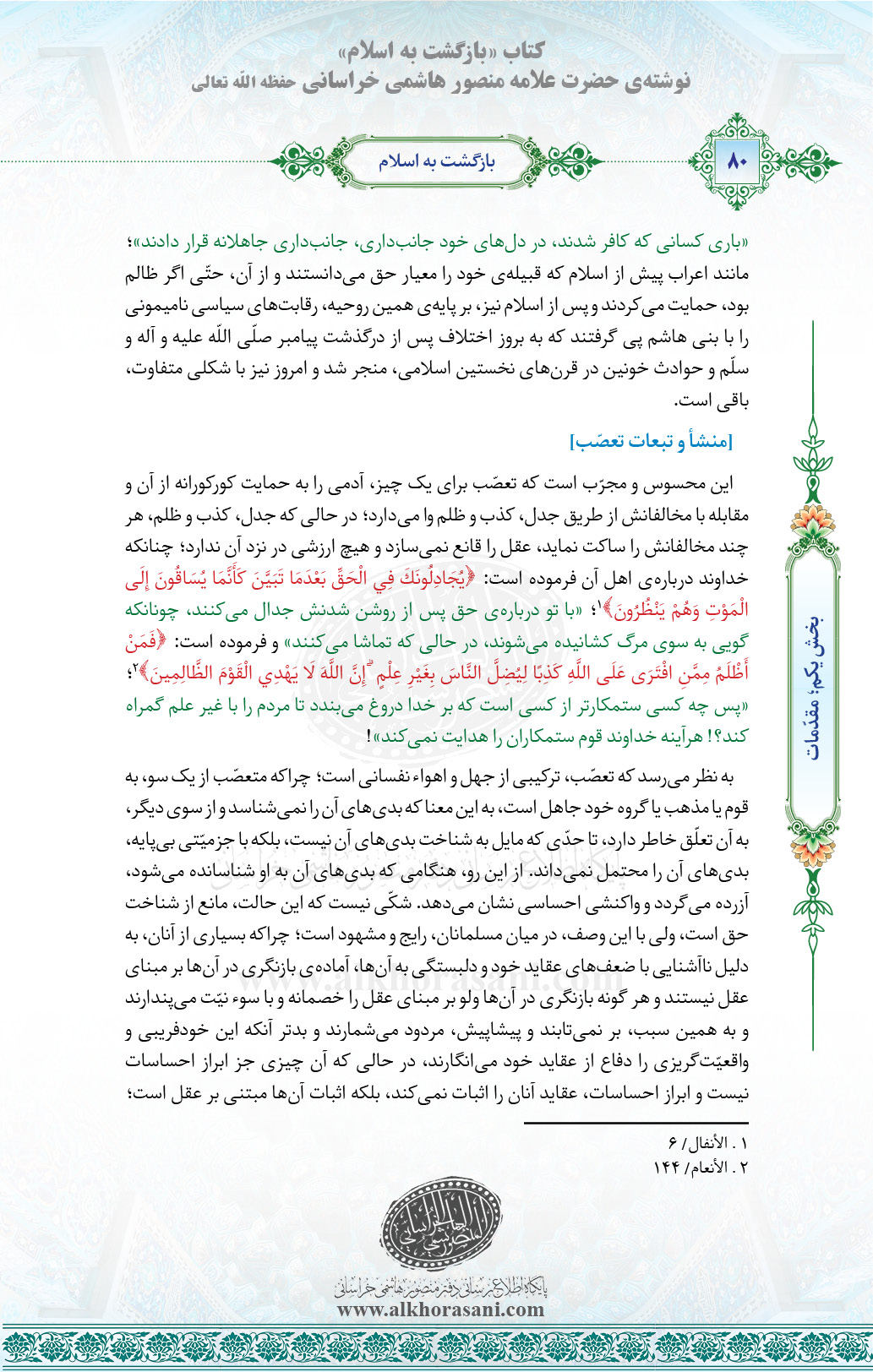 پرسش جدید: شخصی دست دختر بچه‌ی بازیگوشی که به امانت به او سپرده شده بود و النگویی در دست داشت را محکم گرفت تا به این طرف و آن طرف ندود، اما بعداً متوجّه شد که جای النگوی دخترک با فشار دست او قرمز شده و اکنون می‌خواهد بداند که آیا دیه‌ای بر گردن اوست؟ برای مطالعه و دریافت پاسخ، اینجا را کلیک کنید. درس جدید: درس‌هایی از آن جناب درباره‌ی اینکه زمین از مردی عالم به همه‌ی دین که خداوند او را در آن خلیفه، امام و راهنمایی به امر خود قرار داده باشد، خالی نمی‌ماند؛ آیاتی از قرآن در این باره؛ آیه‌ی ۱۹. برای مطالعه‌ی آن، اینجا را کلیک کنید. گفتار جدید: چهار گفتار از آن جناب در بیان اینکه علم حروف و حساب جمّل، اعتباری ندارد، بلکه کهانت محسوب می‌شود. برای مطالعه و دریافت آن، اینجا را کلیک کنید. نکته‌ی جدید: شعر «افتاده یوغ ستم بر گردن جهان...» سروده‌ی «مهدی رضوی» منتشر شد. برای مطالعه و دریافت آن، اینجا را کلیک کنید. برای مطالعه‌ی مهم‌ترین مطالب پایگاه، به صفحه‌ی اصلی مراجعه کنید. نقد جدید: حضرت علامه در نامه‌ی شماره‌ی ۶ فرموده‌اند: «هر چیزی غیر خدا که شما را به خود مشغول کند، شیطان است». می‌خواستم منظور ایشان از این جمله را بدانم. مثلاً اگر درگیر شغلی بودیم برای امرار معاش خود و خانواده باز هم شیطان است؟ برای مطالعه و دریافت بررسی، اینجا را کلیک کنید. فیلم جدید: فیلم جدیدی با موضوع «تقلید و اجتهاد (۱)» منتشر شد. برای مشاهده و دریافت آن، اینجا را کلیک کنید. کتاب جدید: نسخه‌ی سوم کتاب ارزشمند «سبل السّلام؛ مجموعه‌ی نامه‌ها و گفتارهای فارسی حضرت علامه منصور هاشمی خراسانی حفظه الله تعالی» منتشر شد. برای مطالعه و دریافت آن، اینجا را کلیک کنید. نامه‌ی جدید: فرازی از نامه‌ی آن جناب که در آن درباره‌ی شدّت گرفتن بلا هشدار می‌دهد و علّت آن و راه جلوگیری از آن را تبیین می‌کند. برای مطالعه و دریافت آن، اینجا را کلیک کنید. برای مطالعه‌ی مهم‌ترین مطالب پایگاه، به صفحه‌ی اصلی مراجعه کنید.
