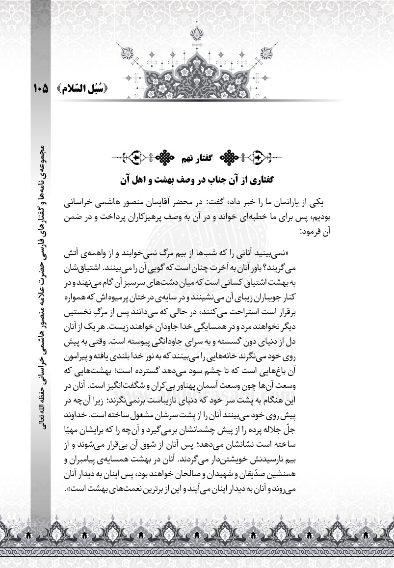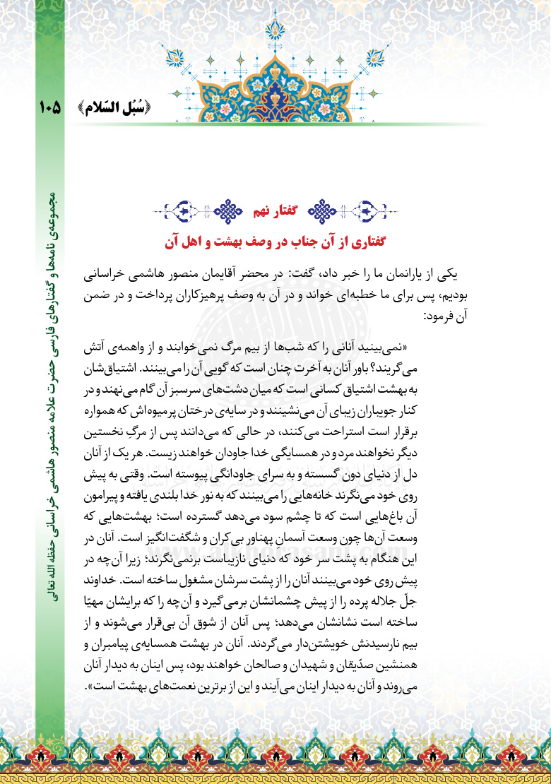 «نمی‌بینید آنانی را که شب‌ها از بیم مرگ نمی‌خوابند و از واهمه‌ی آتش می‌گریند؟ باور آنان به آخرت چنان است که گویی آن را می‌بینند. اشتیاق‌شان به بهشت اشتیاق کسانی است که میان دشت‌های سرسبز آن گام می‌نهند و در کنار جویباران زیبای آن می‌نشینند و در سایه‌ی درختان پرمیوه‌اش که همواره برقرار است استراحت می‌کنند، در حالی که می‌دانند پس از مرگِ نخستین دیگر نخواهند مرد و در همسایگی خدا جاودان خواهند زیست. هر یک از آنان دل از دنیای دون گسسته و به سرای جاودانگی پیوسته است. وقتی به پیش روی خود می‌نگرند خانه‌هایی را می‌بینند که به نور خدا بلندی یافته و پیرامون آن باغ‌هایی است که تا چشم سود می‌دهد گسترده است؛ بهشت‌هایی که وسعت آن‌ها چون وسعت آسمانِ پهناور بی‌کران و شگفت‌انگیز است. آنان در این هنگام به پشت سر خود که دنیای نازیباست برنمی‌نگرند؛ زیرا آن‌چه در پیش روی خود می‌بینند آنان را از پشت سرشان مشغول ساخته است. خداوند جلّ جلاله پرده را از پیش چشمانشان برمی‌گیرد و آن‌چه را که برایشان مهیّا ساخته است نشانشان می‌دهد؛ پس آنان از شوق آن بی‌قرار می‌شوند و از بیم نارسیدنش خویشتن‌دار می‌گردند. آنان در بهشت همسایه‌ی پیامبران و همنشین صدّیقان و شهیدان و صالحان خواهند بود، پس اینان به دیدار آنان می‌روند و آنان به دیدار اینان می‌آیند و این از برترین نعمت‌های بهشت است».