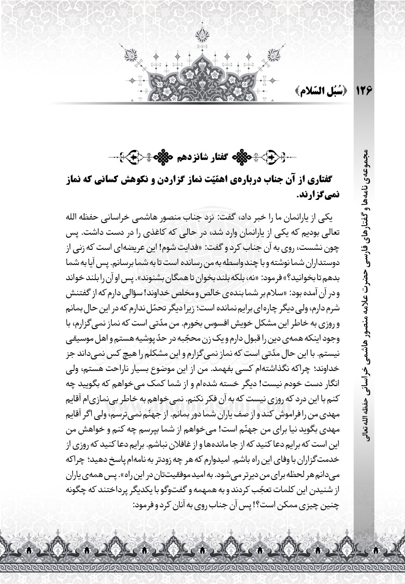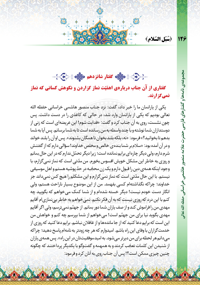 یکی از یارانمان ما را خبر داد، گفت: نزد جناب منصور هاشمی خراسانی حفظه الله تعالی بودیم که یکی از یارانمان وارد شد، در حالی که کاغذی را در دست داشت. پس چون نشست، روی به آن جناب کرد و گفت: «فدایت شوم! این عریضه‌ای است که زنی از دوستداران شما نوشته و با چند واسطه به من رسانده است تا به شما برسانم. پس آیا به شما بدهم تا بخوانید؟» فرمود: «نه، بلکه بلند بخوان تا همگان بشنوند». پس او آن را بلند خواند و در آن آمده بود: «سلام بر شما بنده‌ی خالص و مخلص خداوند! سؤالی دارم که از گفتنش شرم دارم، ولی دیگر چاره‌ای برایم نمانده است؛ زیرا دیگر تحمّل ندارم که در این حال بمانم و روزی به خاطر این مشکل خویش افسوس بخورم. من مدّتی است که نماز نمی‌گزارم، با وجود اینکه همه‌ی دین را قبول دارم و یک زن محجّبه در حدّ پوشیه هستم و اهل موسیقی نیستم. با این حال مدّتی است که نماز نمی‌گزارم و این مشکلم را هیچ کس نمی‌داند جز خداوند؛ چراکه نگذاشته‌ام کسی بفهمد. من از این موضوع بسیار ناراحت هستم، ولی انگار دست خودم نیست! دیگر خسته شده‌ام و از شما کمک می‌خواهم که بگویید چه کنم با این درد که روزی نیست که به آن فکر نکنم. نمی‌خواهم به خاطر بی‌نمازی‌ام آقایم مهدی من را فراموش کند و از صف یاران شما دور بمانم. از جهنّم نمی‌ترسم، ولی اگر آقایم مهدی بگوید نیا برای من جهنّم است! می‌خواهم از شما بپرسم چه کنم و خواهش من این است که برایم دعا کنید که از جا مانده‌ها و از غافلان نباشم. برایم دعا کنید که روزی از خدمت‌گزاران با وفای این راه باشم. امیدوارم که هر چه زودتر به نامه‌ام پاسخ دهید؛ چراکه می‌دانم هر لحظه برای من دیرتر می‌شود. به امید موفقیت‌تان در این راه». پس همه‌ی یاران از شنیدن این کلمات تعجّب کردند و به همهمه و گفت‌وگو با یکدیگر پرداختند که چگونه چنین چیزی ممکن است؟! پس آن جناب روی به آنان کرد و فرمود: