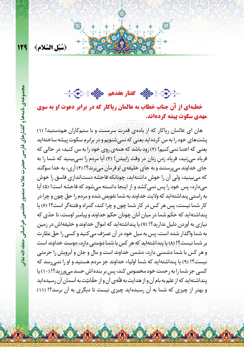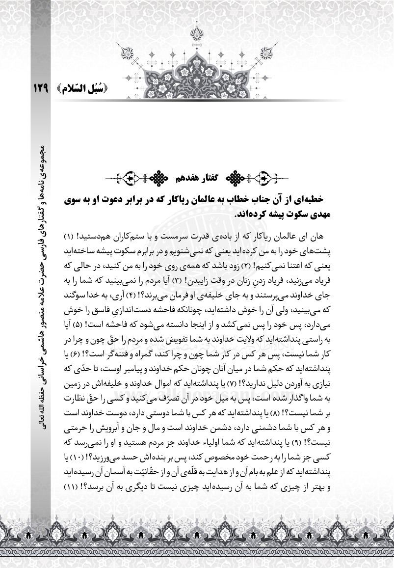 هان ای عالمان ریاکار که از باده‌ی قدرت سرمست و با ستم‌کاران هم‌دستید! (۱) پشت‌های خود را به من کرده‌اید یعنی که نمی‌شنویم و در برابرم سکوت پیشه ساخته‌اید یعنی که اعتنا نمی‌کنیم! (۲) زود باشد که همه‌ی روی خود را به من کنید، در حالی که فریاد می‌زنید، فریاد زدنِ زنان در وقت زاییدن! (۳) آیا مردم را نمی‌بینید که شما را به جای خداوند می‌پرستند و به جای خلیفه‌ی او فرمان می‌برند؟! (۴) آری، به خدا سوگند که می‌بینید، ولی آن را خوش داشته‌اید، چونانکه فاحشه دست‌اندازیِ فاسق را خوش می‌دارد، پس خود را پس نمی‌کشد و از اینجا دانسته می‌شود که فاحشه است! (۵) آیا به راستی پنداشته‌اید که ولایت خداوند به شما تفویض شده و مردم را حقّ چون و چرا در کار شما نیست، پس هر کس در کار شما چون و چرا کند، گمراه و فتنه‌گر است؟! (۶) یا پنداشته‌اید که حکم شما در میان آنان چونان حکم خداوند و پیامبر اوست، تا حدّی که نیازی به آوردن دلیل ندارید؟! (۷) یا پنداشته‌اید که اموال خداوند و خلیفه‌اش در زمین به شما واگذار شده است، پس به میل خود در آن تصرّف می‌کنید و کسی را حقّ نظارت بر شما نیست؟! (۸) یا پنداشته‌اید که هر کس با شما دوستی دارد، دوست خداوند است و هر کس با شما دشمنی دارد، دشمن خداوند است و مال و جان و آبرویش را حرمتی نیست؟! (۹) یا پنداشته‌اید که شما اولیاء خداوند جز مردم هستید و او را نمی‌رسد که کسی جز شما را به رحمت خود مخصوص کند، پس بر بنده‌اش حسد می‌ورزید؟! (۱۰) یا پنداشته‌اید که از علم به بام آن و از هدایت به قلّه‌ی آن و از حقّانیّت به آسمان آن رسیده‌اید و بهتر از چیزی که شما به آن رسیده‌اید چیزی نیست تا دیگری به آن برسد؟! (۱۱)