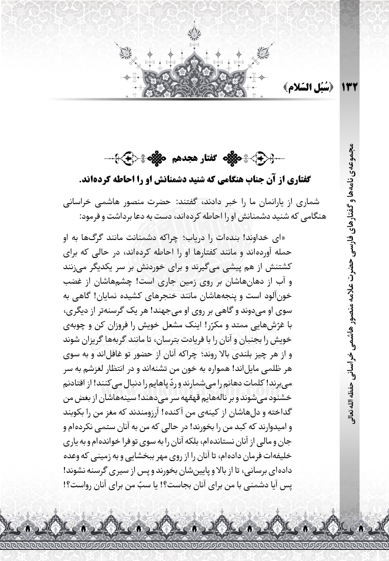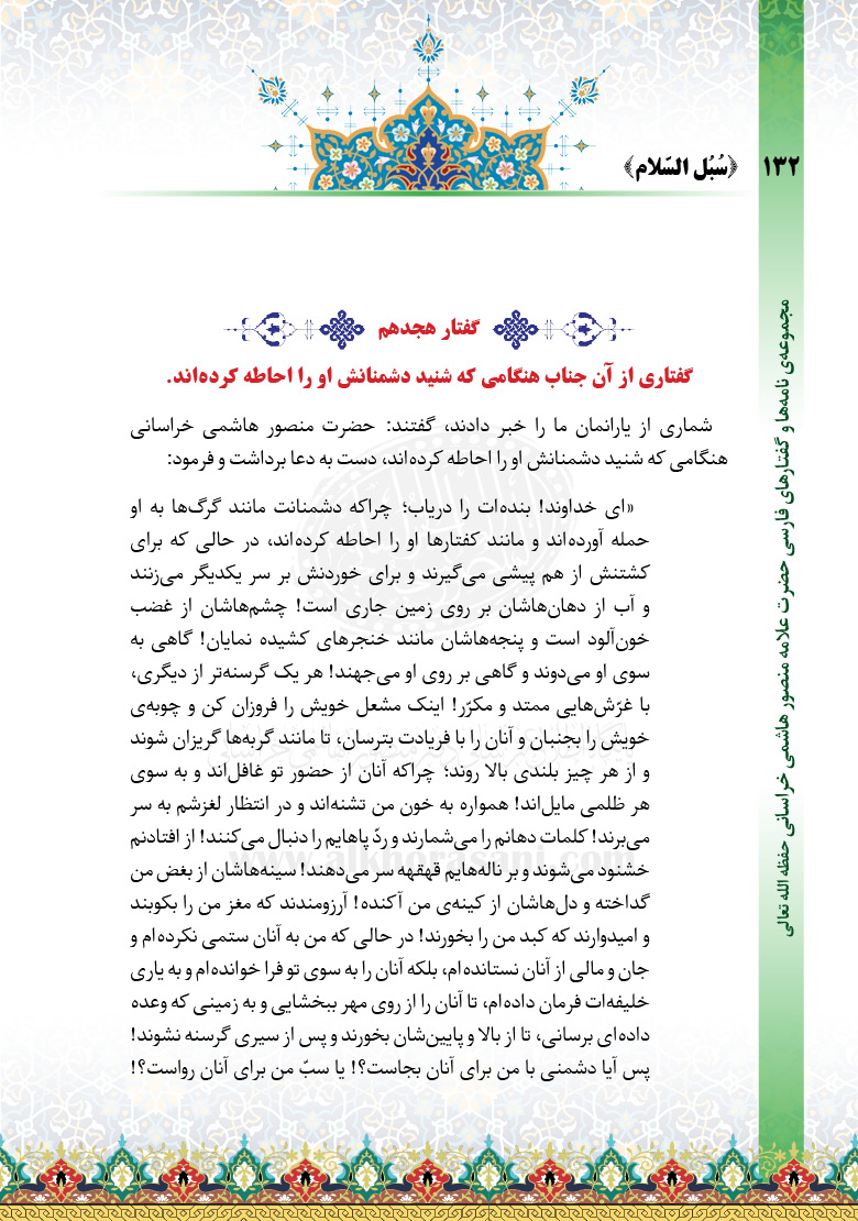 شماری از یارانمان ما را خبر دادند، گفتند: حضرت منصور هاشمی خراسانی هنگامی که شنید دشمنانش او را احاطه کرده‌اند، دست به دعا برداشت و فرمود: