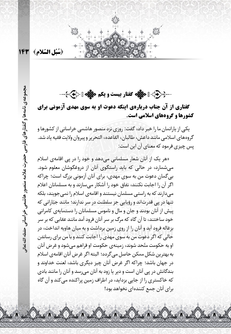 یکی از یارانمان ما را خبر داد، گفت: روزی نزد منصور هاشمی خراسانی از کشورها و گروه‌های اسلامی مانند داعش، طالبان، القاعده، التحریر و پیروان ولایت فقیه یاد شد. پس چیزی فرمود که معنای آن این است: