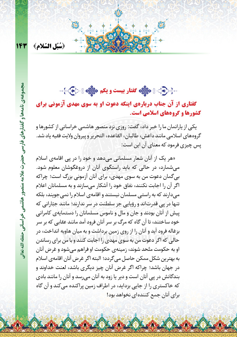 «هر یک از آنان شعار مسلمانی می‌دهد و خود را در پی اقامه‌ی اسلام می‌شمارد، در حالی که باید راستگوی آنان از دروغگوشان معلوم شود. بی‌گمان دعوت من به سوی مهدی، برای آنان آزمونی بزرگ است؛ چراکه اگر آن‌ را اجابت نکنند، نفاق خود را آشکار می‌سازند و به مسلمانان اعلام می‌دارند که به راستی مسلمان نیستند و اقامه‌ی اسلام را نمی‌جویند، بلکه تنها در پی قدرت‌اند و رؤیایی جز سلطنت در سر ندارند؛ مانند جبّارانی که پیش از آنان بودند و جان و مال و ناموس مسلمانان را دستمایه‌ی کامرانی خود ساختند، تا آن گاه که مرگ بر سر آنان فرود آمد مانند عقابی که بر سر بزغاله فرود آید و آنان را از روی زمین برداشت و به میان هاویه انداخت، در حالی که اگر دعوت من به سوی مهدی را اجابت کنند و با من برای رساندن او به حکومت متّحد شوند، زمینه‌ی حکومت او فراهم می‌شود و غرض آنان به بهترین شکل ممکن حاصل می‌گردد؛ البته اگر غرض آنان اقامه‌ی اسلام در جهان باشد؛ چراکه اگر غرض آنان چیز دیگری باشد، لعنت خداوند و بندگانش در پی آنان است و دیر یا زود به آنان می‌رسد و آنان را مانند بادی که خاکستری را از جایی بزداید، در اطراف زمین پراکنده می‌کند و آن گاه برای آنان جمع کننده‌ای نخواهد بود!