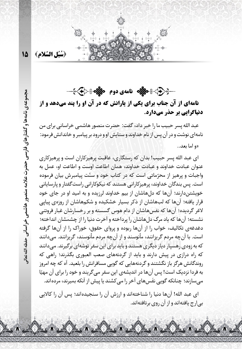نامه‌ای از آن جناب برای یکی از یارانش که در آن او را پند می‌دهد و از دنیاگرایی بر حذر می‌دارد.
