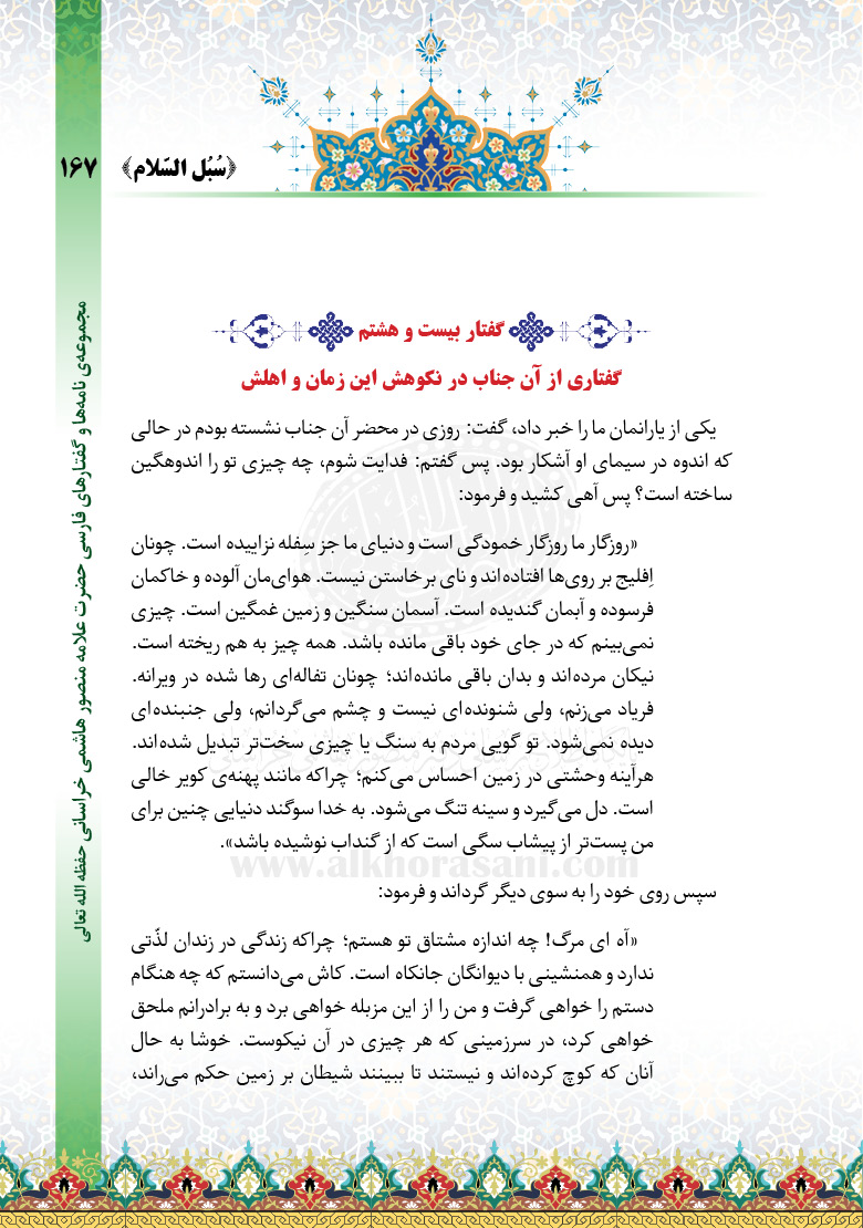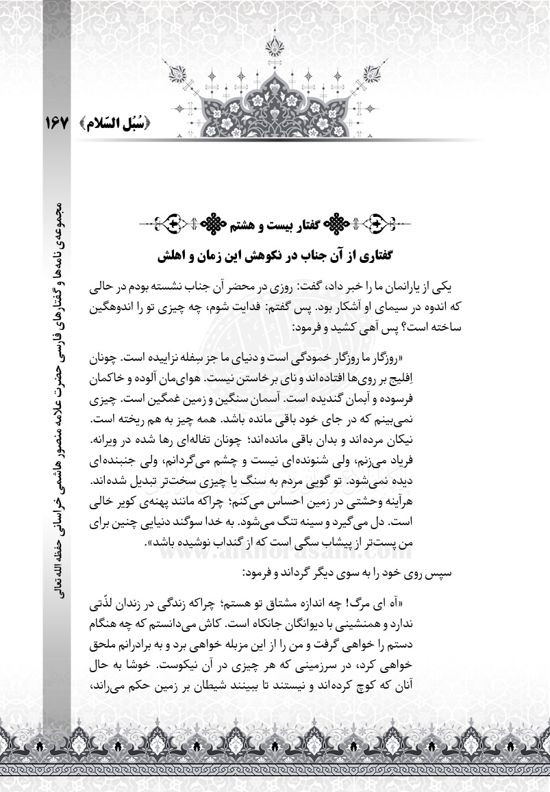 پرسش جدید: شخصی دست دختر بچه‌ی بازیگوشی که به امانت به او سپرده شده بود و النگویی در دست داشت را محکم گرفت تا به این طرف و آن طرف ندود، اما بعداً متوجّه شد که جای النگوی دخترک با فشار دست او قرمز شده و اکنون می‌خواهد بداند که آیا دیه‌ای بر گردن اوست؟ برای مطالعه و دریافت پاسخ، اینجا را کلیک کنید. درس جدید: درس‌هایی از آن جناب درباره‌ی اینکه زمین از مردی عالم به همه‌ی دین که خداوند او را در آن خلیفه، امام و راهنمایی به امر خود قرار داده باشد، خالی نمی‌ماند؛ آیاتی از قرآن در این باره؛ آیه‌ی ۱۹. برای مطالعه‌ی آن، اینجا را کلیک کنید. گفتار جدید: چهار گفتار از آن جناب در بیان اینکه علم حروف و حساب جمّل، اعتباری ندارد، بلکه کهانت محسوب می‌شود. برای مطالعه و دریافت آن، اینجا را کلیک کنید. نکته‌ی جدید: شعر «افتاده یوغ ستم بر گردن جهان...» سروده‌ی «مهدی رضوی» منتشر شد. برای مطالعه و دریافت آن، اینجا را کلیک کنید. برای مطالعه‌ی مهم‌ترین مطالب پایگاه، به صفحه‌ی اصلی مراجعه کنید. نقد جدید: حضرت علامه در نامه‌ی شماره‌ی ۶ فرموده‌اند: «هر چیزی غیر خدا که شما را به خود مشغول کند، شیطان است». می‌خواستم منظور ایشان از این جمله را بدانم. مثلاً اگر درگیر شغلی بودیم برای امرار معاش خود و خانواده باز هم شیطان است؟ برای مطالعه و دریافت بررسی، اینجا را کلیک کنید. فیلم جدید: فیلم جدیدی با موضوع «تقلید و اجتهاد (۱)» منتشر شد. برای مشاهده و دریافت آن، اینجا را کلیک کنید. کتاب جدید: نسخه‌ی سوم کتاب ارزشمند «سبل السّلام؛ مجموعه‌ی نامه‌ها و گفتارهای فارسی حضرت علامه منصور هاشمی خراسانی حفظه الله تعالی» منتشر شد. برای مطالعه و دریافت آن، اینجا را کلیک کنید. نامه‌ی جدید: فرازی از نامه‌ی آن جناب که در آن درباره‌ی شدّت گرفتن بلا هشدار می‌دهد و علّت آن و راه جلوگیری از آن را تبیین می‌کند. برای مطالعه و دریافت آن، اینجا را کلیک کنید. برای مطالعه‌ی مهم‌ترین مطالب پایگاه، به صفحه‌ی اصلی مراجعه کنید.