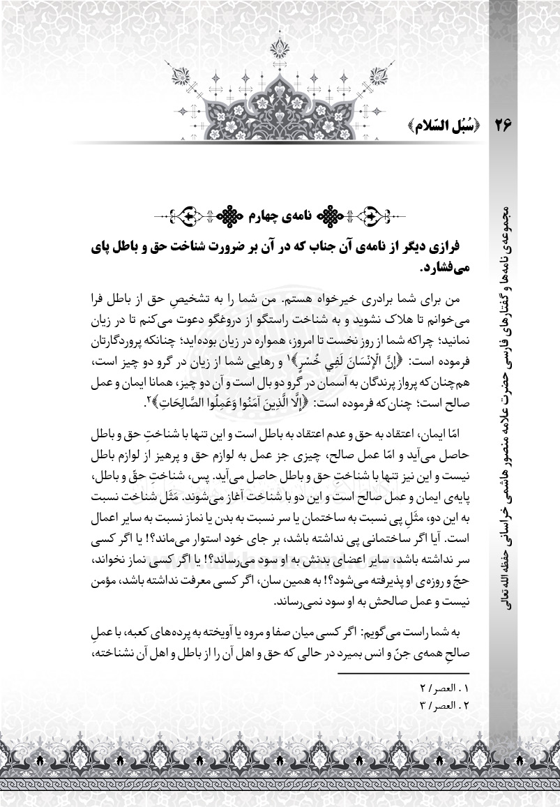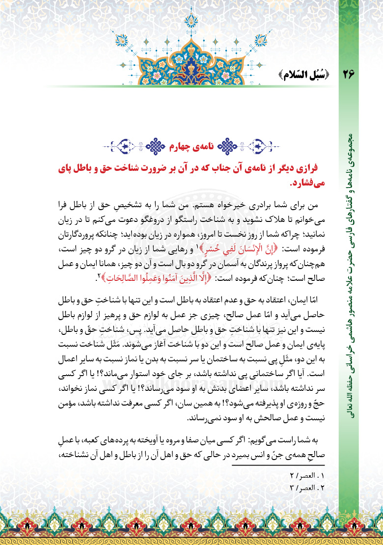 فرازی دیگر از نامه‌ی آن جناب که در آن بر ضرورت شناخت حق و باطل پای می‌فشارد.