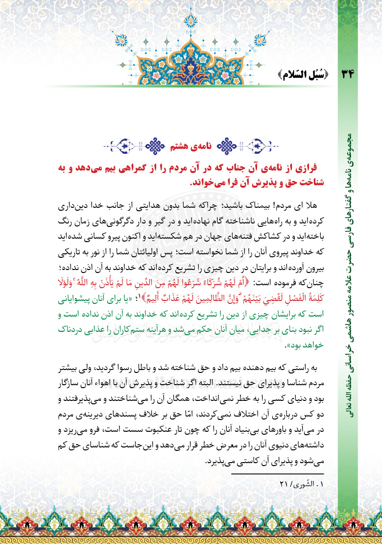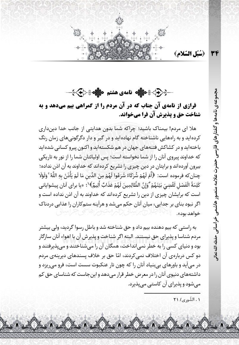 فرازی از نامه‌ی آن جناب که در آن مردم را از گمراهی بیم می‌دهد و به شناخت حق و پذیرش آن فرا می‌خواند.