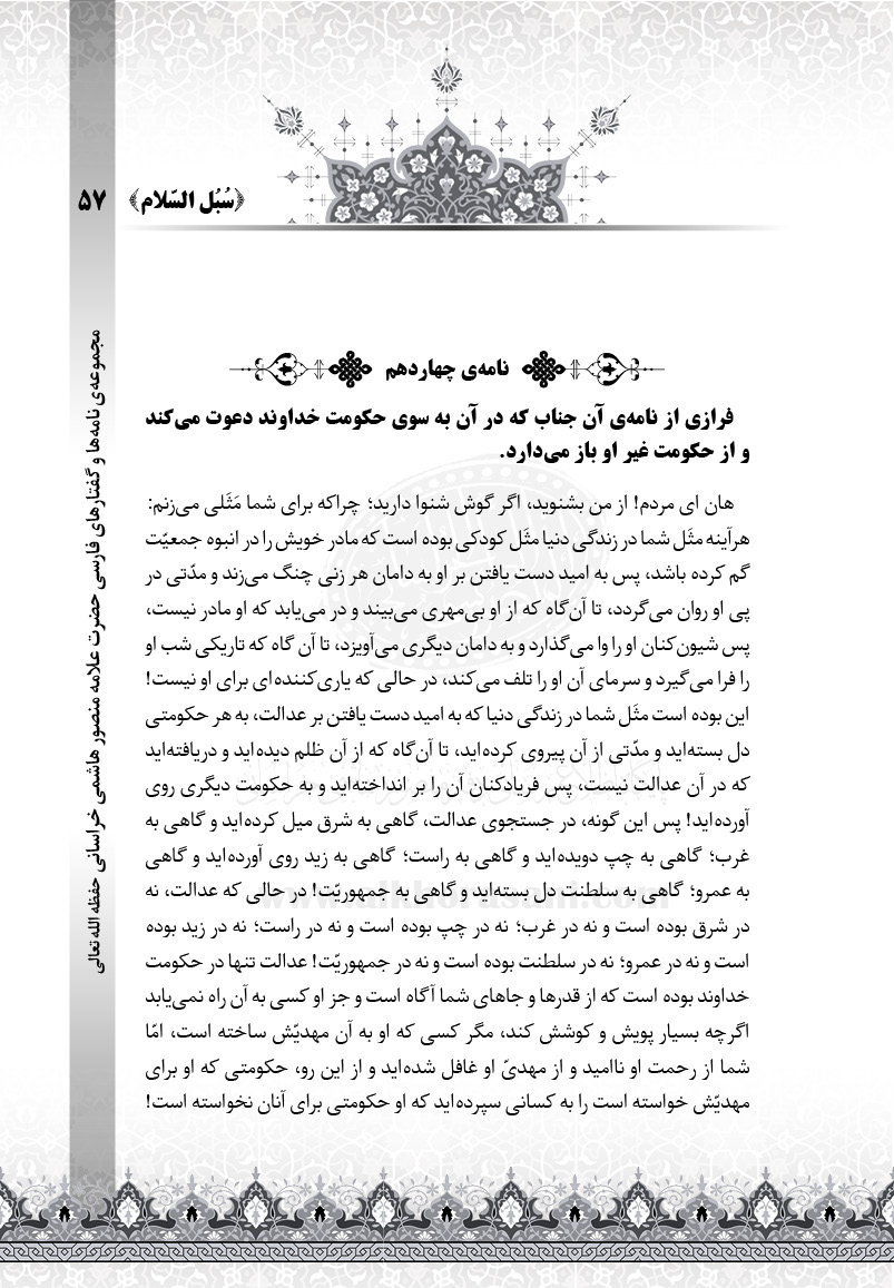 پرسش جدید: شخصی دست دختر بچه‌ی بازیگوشی که به امانت به او سپرده شده بود و النگویی در دست داشت را محکم گرفت تا به این طرف و آن طرف ندود، اما بعداً متوجّه شد که جای النگوی دخترک با فشار دست او قرمز شده و اکنون می‌خواهد بداند که آیا دیه‌ای بر گردن اوست؟ برای مطالعه و دریافت پاسخ، اینجا را کلیک کنید. درس جدید: درس‌هایی از آن جناب درباره‌ی اینکه زمین از مردی عالم به همه‌ی دین که خداوند او را در آن خلیفه، امام و راهنمایی به امر خود قرار داده باشد، خالی نمی‌ماند؛ آیاتی از قرآن در این باره؛ آیه‌ی ۱۹. برای مطالعه‌ی آن، اینجا را کلیک کنید. گفتار جدید: چهار گفتار از آن جناب در بیان اینکه علم حروف و حساب جمّل، اعتباری ندارد، بلکه کهانت محسوب می‌شود. برای مطالعه و دریافت آن، اینجا را کلیک کنید. نکته‌ی جدید: شعر «افتاده یوغ ستم بر گردن جهان...» سروده‌ی «مهدی رضوی» منتشر شد. برای مطالعه و دریافت آن، اینجا را کلیک کنید. برای مطالعه‌ی مهم‌ترین مطالب پایگاه، به صفحه‌ی اصلی مراجعه کنید. نقد جدید: حضرت علامه در نامه‌ی شماره‌ی ۶ فرموده‌اند: «هر چیزی غیر خدا که شما را به خود مشغول کند، شیطان است». می‌خواستم منظور ایشان از این جمله را بدانم. مثلاً اگر درگیر شغلی بودیم برای امرار معاش خود و خانواده باز هم شیطان است؟ برای مطالعه و دریافت بررسی، اینجا را کلیک کنید. فیلم جدید: فیلم جدیدی با موضوع «تقلید و اجتهاد (۱)» منتشر شد. برای مشاهده و دریافت آن، اینجا را کلیک کنید. کتاب جدید: نسخه‌ی سوم کتاب ارزشمند «سبل السّلام؛ مجموعه‌ی نامه‌ها و گفتارهای فارسی حضرت علامه منصور هاشمی خراسانی حفظه الله تعالی» منتشر شد. برای مطالعه و دریافت آن، اینجا را کلیک کنید. نامه‌ی جدید: فرازی از نامه‌ی آن جناب که در آن درباره‌ی شدّت گرفتن بلا هشدار می‌دهد و علّت آن و راه جلوگیری از آن را تبیین می‌کند. برای مطالعه و دریافت آن، اینجا را کلیک کنید. برای مطالعه‌ی مهم‌ترین مطالب پایگاه، به صفحه‌ی اصلی مراجعه کنید.