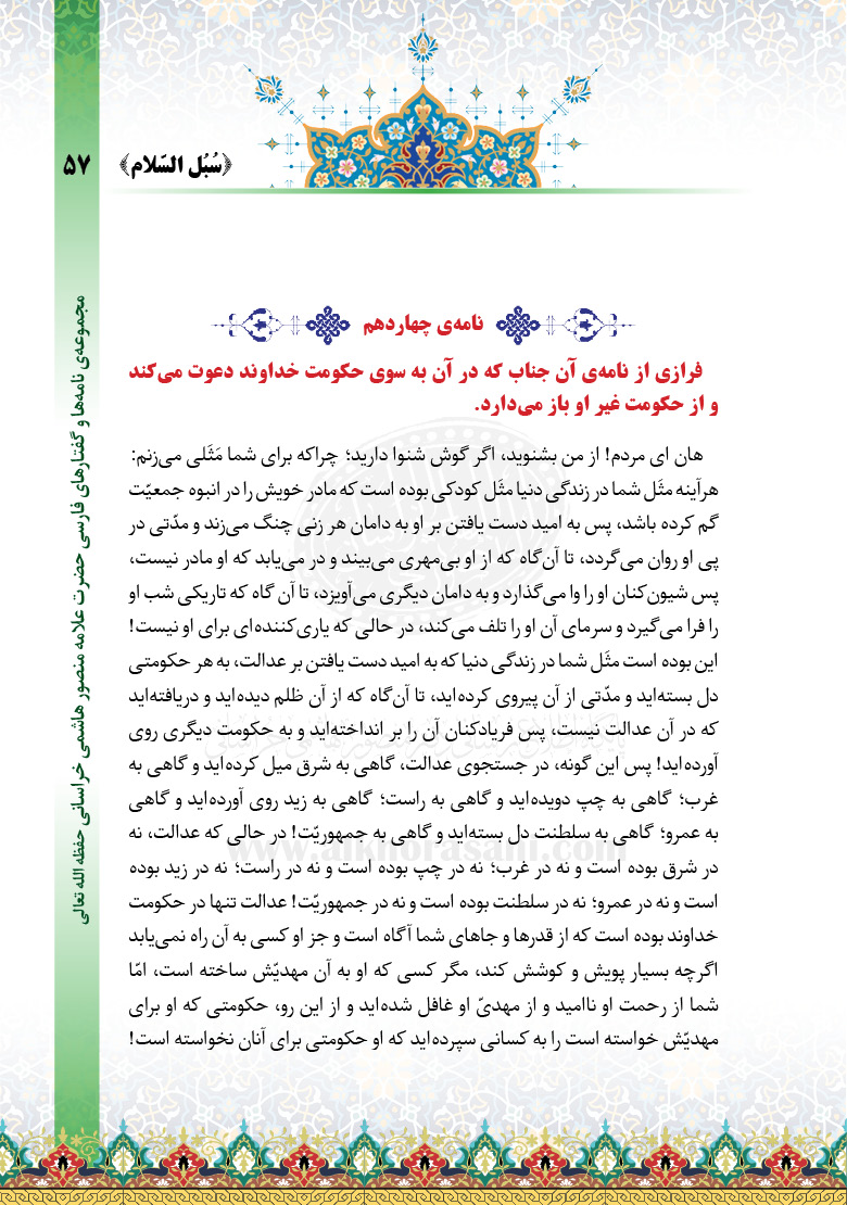 فرازی از نامه‌ی آن جناب که در آن به سوی حکومت خداوند دعوت می‌کند و از حکومت غیر او باز می‌دارد.