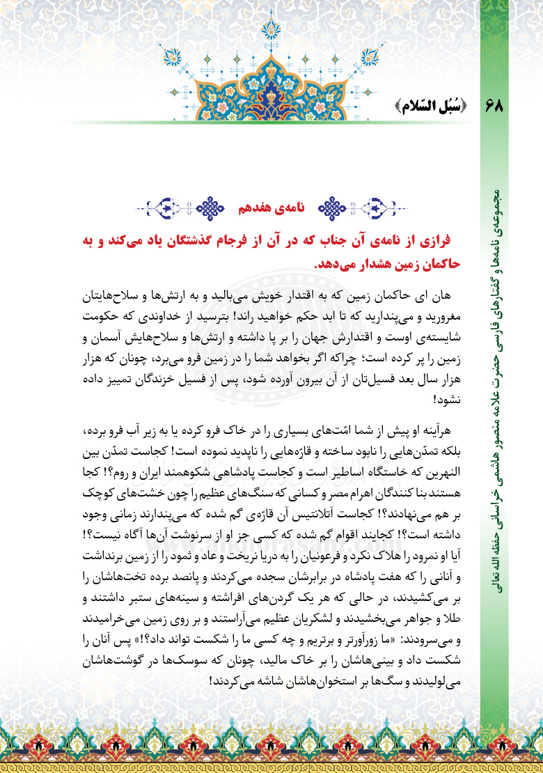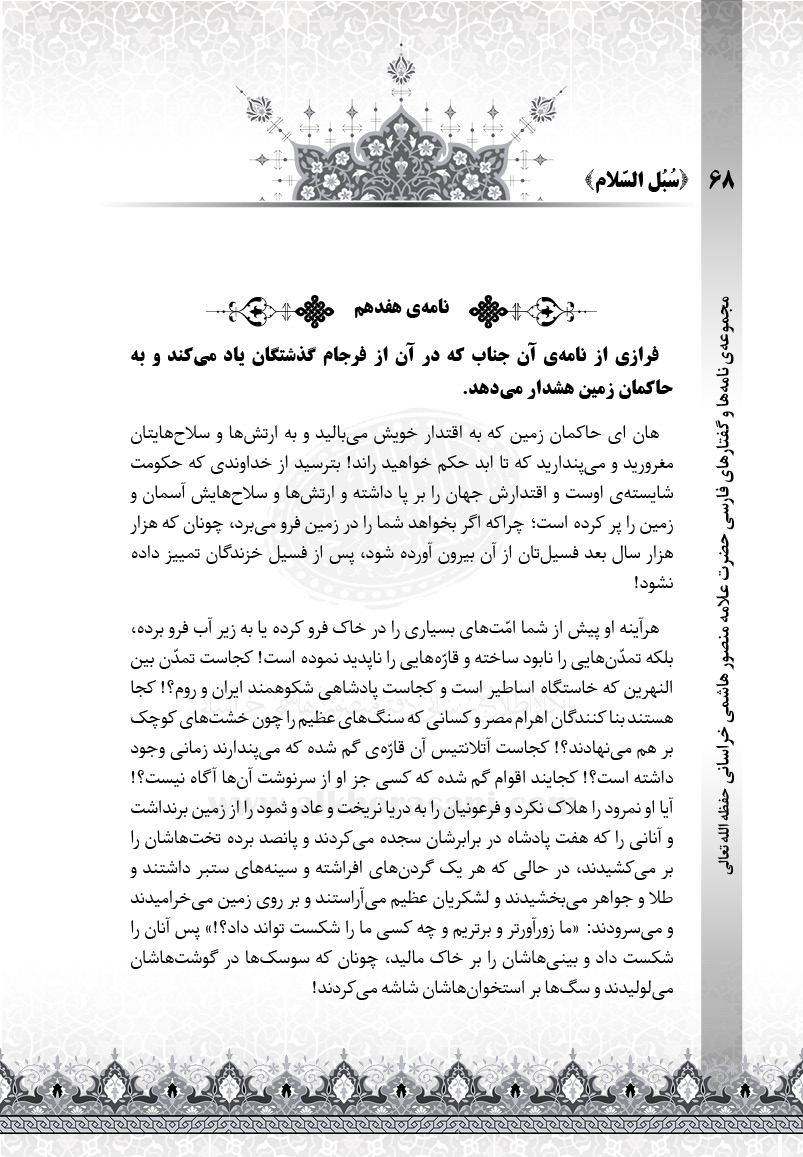 فرازی از نامه‌ی آن جناب که در آن از فرجام گذشتگان یاد می‌کند و به حاکمان زمین هشدار می‌دهد.