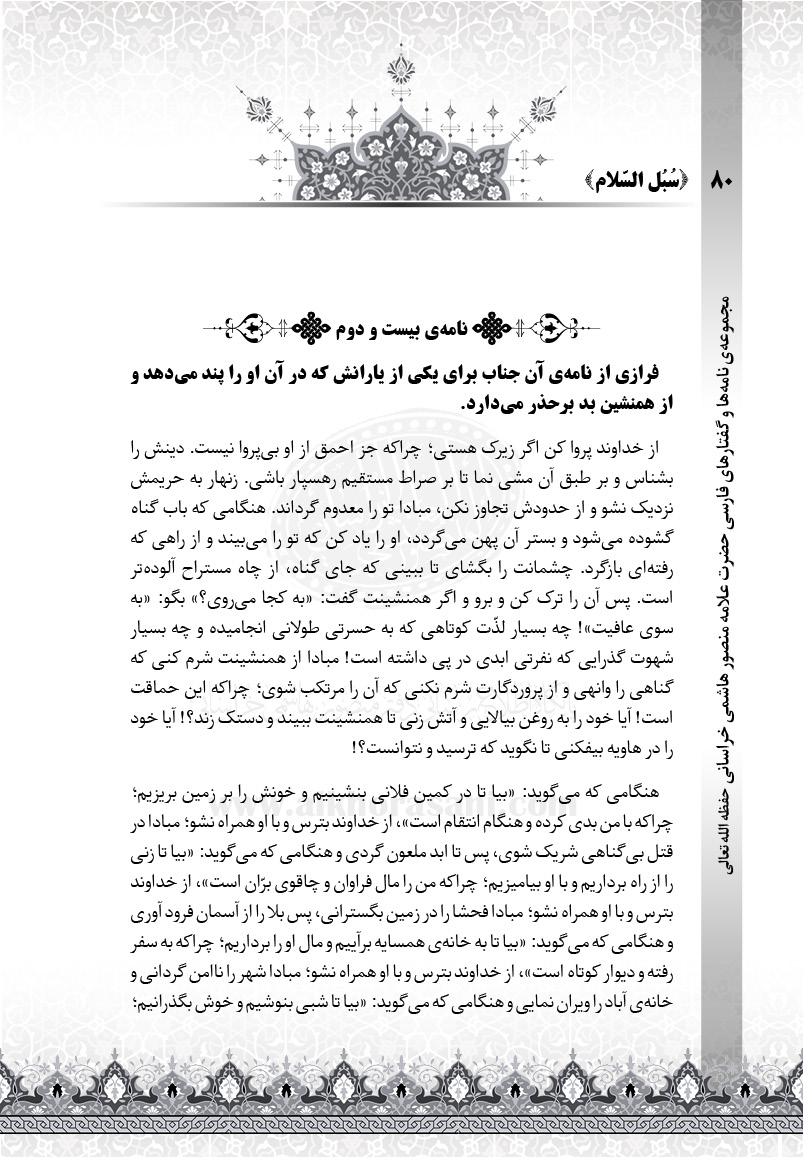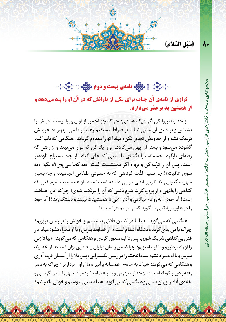 فرازی از نامه‌ی آن جناب برای یکی از یارانش که در آن او را پند می‌دهد و از همنشین بد برحذر می‌دارد.