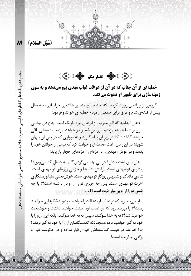 خطبه‌ای از آن جناب که در آن از عواقب غیاب مهدی بیم می‌دهد و به سوی زمینه‌سازی برای ظهور او دعوت می‌کند.