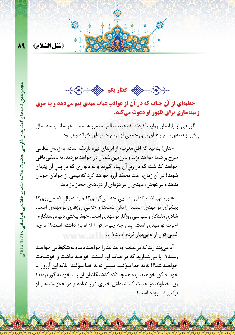 «هان! بدانید که افقِ مغرب، از ابرهای تیره تاریک است. به زودی توفانی سرخ بر شما خواهد وزید و سرزمینِ شما را در خواهد نوردید. نه سقفی باقی خواهد گذاشت که در زیرِ آن پناه گیرید و نه دیواری که در پسِ آن پنهان شوید! در آن زمان، امّت محمّد آرزو خواهد کرد که نیمی از جوانان خود را بدهد و در عوض، مهدی را در درّه‌ای از درّه‌های حجاز باز یابد!