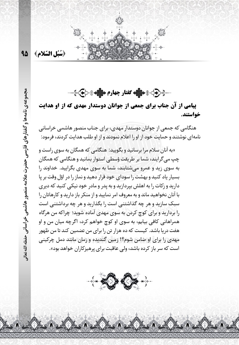 پیامی از آن جناب برای جمعی از جوانان دوستدار مهدی که از او هدایت خواستند.