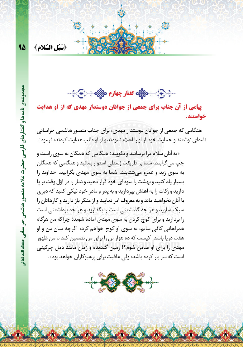 هنگامی که جمعی از جوانان دوستدار مهدی، برای جناب منصور هاشمی خراسانی نامه‌ای نوشتند و حمایت خود از او را اعلام نمودند و از او طلب هدایت کردند، فرمود:
