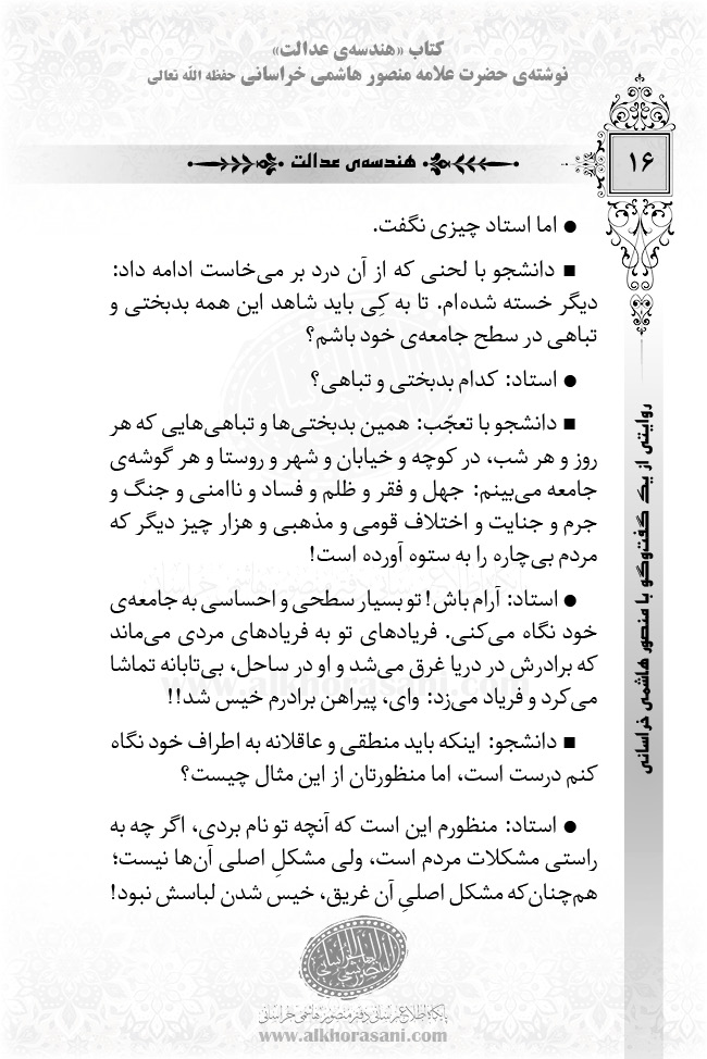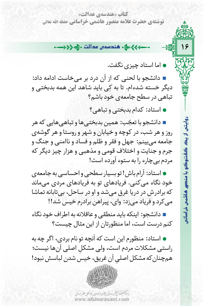 استاد: منظورم این است که آنچه تو نام بردی، اگر چه به راستی مشکلات مردم است، ولی مشکلِ اصلی آن‌ها نیست؛ هم‌چنان‌که مشکل اصلیِ آن غریق، خیس شدن لباسش نبود!