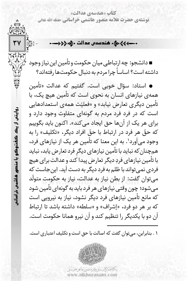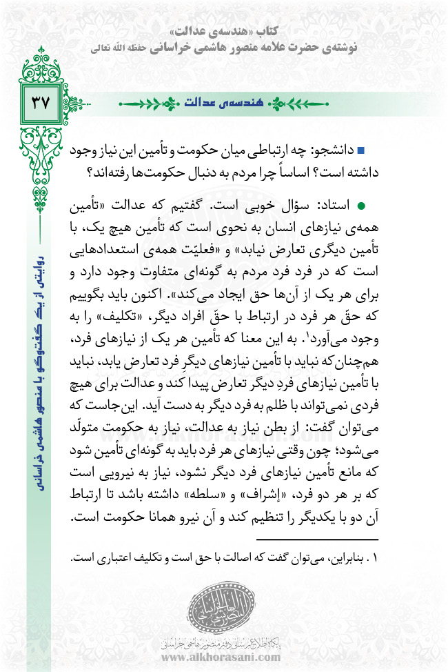 استاد: سؤال خوبی است. گفتیم که عدالت «تأمین همه‌ی نیازهای انسان به نحوی است که تأمین هیچ یک، با تأمین دیگری تعارض نیابد» و «فعلیّت همه‌ی استعدادهایی است که در فرد فرد مردم به گونه‌ای متفاوت وجود دارد و برای هر یک از آن‌ها حق ایجاد می‌کند». اکنون باید بگوییم که حقّ هر فرد در ارتباط با حقّ افراد دیگر، «تکلیف» را به وجود می‌آورد[۱]. به این معنا که تأمین هر یک از نیازهای فرد، هم‌چنان‌که نباید با تأمین نیازهای دیگرِ فرد تعارض یابد، نباید با تأمین نیازهای فردِ دیگر تعارض پیدا کند و عدالت برای هیچ فردی نمی‌تواند با ظلم به فرد دیگر به دست آید. این‌جاست که می‌توان گفت: از بطن نیاز به عدالت، نیاز به حکومت متولّد می‌شود؛ چون وقتی نیازهای هر فرد باید به گونه‌ای تأمین شود که مانع تأمین نیازهای فرد دیگر نشود، نیاز به نیرویی است که بر هر دو فرد، «إشراف» و «سلطه» داشته باشد تا ارتباط آن دو با یکدیگر را تنظیم کند و آن نیرو همانا حکومت است.