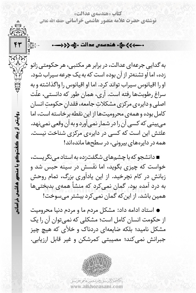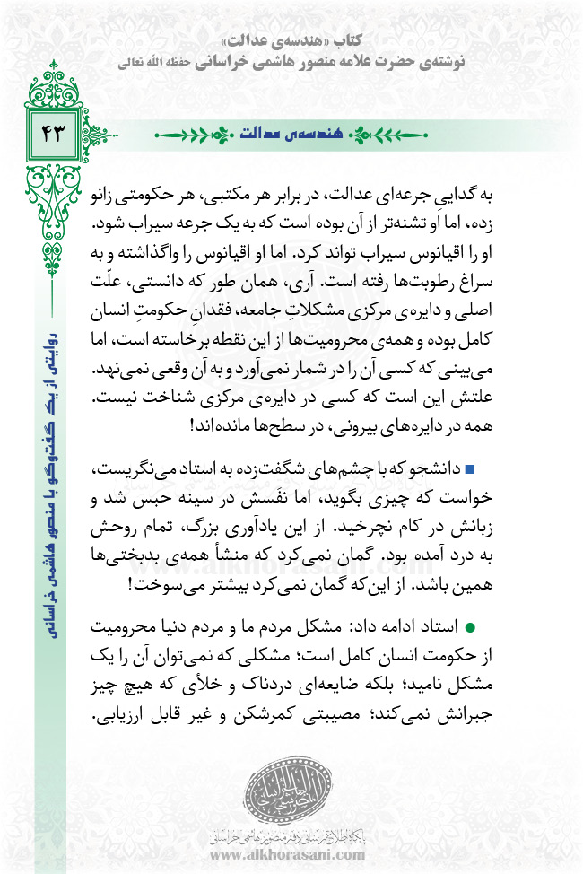 به گداییِ جرعه‌ای عدالت، در برابر هر مکتبی، هر حکومتی زانو زده، اما او تشنه‌تر از آن بوده است که به یک جرعه سیراب شود. او را اقیانوس سیراب تواند کرد. اما او اقیانوس را واگذاشته و به سراغ رطوبت‌ها رفته است. آری، همان ‌طور که دانستی، علّت اصلی و دایره‌ی مرکزی مشکلاتِ جامعه، فقدانِ حکومتِ انسان کامل بوده و همه‌ی محرومیت‌ها از این نقطه برخاسته است، اما می‌بینی که کسی آن را در شمار نمی‌آورد و به آن وقعی نمی‌نهد. علتش این است که کسی در دایره‌ی مرکزی شناخت نیست. همه در دایره‌های بیرونی، در سطح‌ها مانده‌اند!