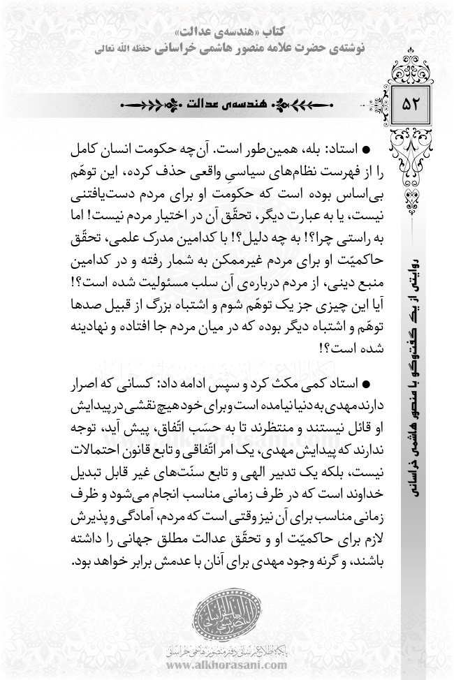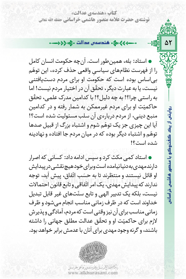استاد: بله، همین‌طور است. آن‌چه حکومت انسان کامل را از فهرست نظام‌های سیاسیِ واقعی حذف کرده، این توهّم بی‌اساس بوده است که حکومت او برای مردم دست‌یافتنی نیست، یا به عبارت دیگر، تحقّق آن در اختیار مردم نیست! اما به راستی چرا؟! به چه دلیل؟! با کدامین مدرک علمی، تحقّق حاکمیّت او برای مردم غیرممکن به شمار رفته و در کدامین منبع دینی، از مردم درباره‌ی آن سلب مسؤولیت شده است؟! آیا این چیزی جز یک توهّم شوم و اشتباه بزرگ از قبیل صدها توهّم و اشتباه دیگر بوده که در میان مردم جا افتاده و نهادینه شده است؟!