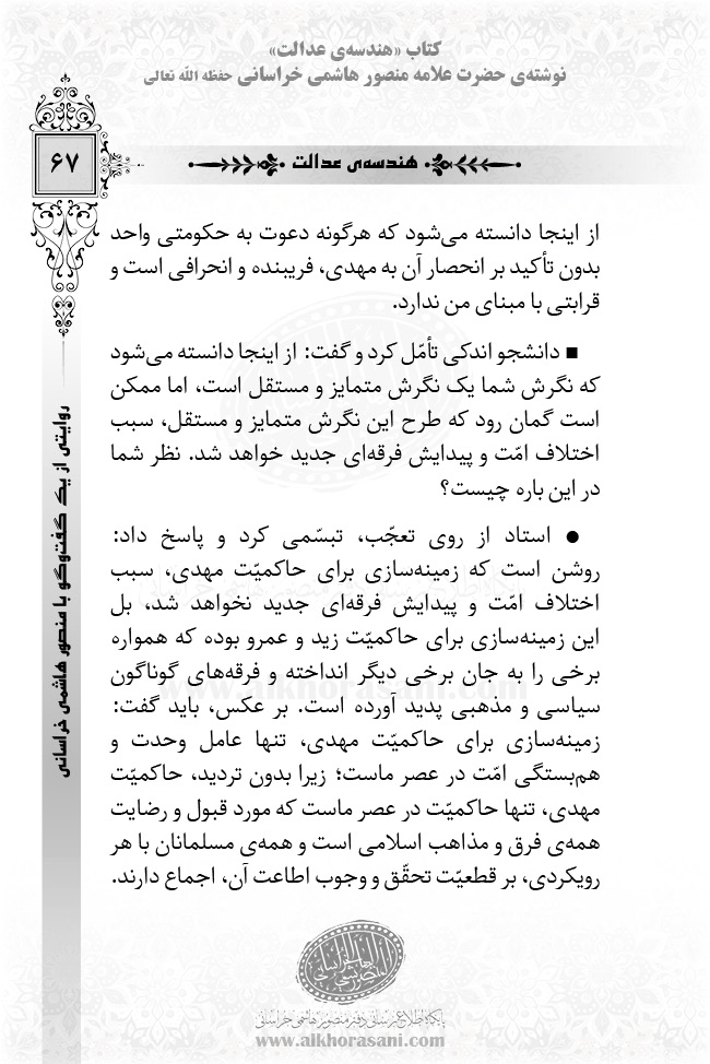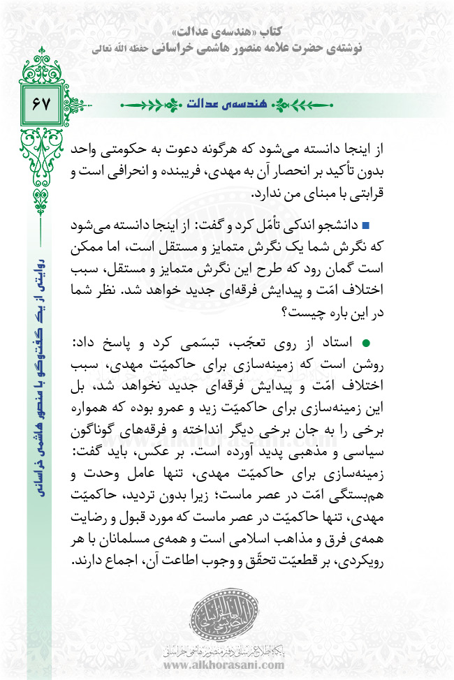 استاد از روی تعجّب، تبسّمی کرد و پاسخ داد: روشن است که زمینه‌سازی برای حاکمیّت مهدی، سبب اختلاف امّت و پیدایش فرقه‌ای جدید نخواهد شد، بل این زمینه‌سازی برای حاکمیّت زید و عمرو بوده که همواره برخی را به جان برخی دیگر انداخته و فرقه‌های گوناگون سیاسی و مذهبی پدید آورده است. بر عکس، باید گفت: زمینه‌سازی برای حاکمیّت مهدی، تنها عامل وحدت و هم‌بستگی امّت در عصر ماست؛ زیرا بدون تردید، حاکمیّت مهدی، تنها حاکمیّت در عصر ماست که مورد قبول و رضایت همه‌ی فرق و مذاهب اسلامی است و همه‌ی مسلمانان با هر رویکردی، بر قطعیّت تحقّق و وجوب اطاعت آن، اجماع دارند.