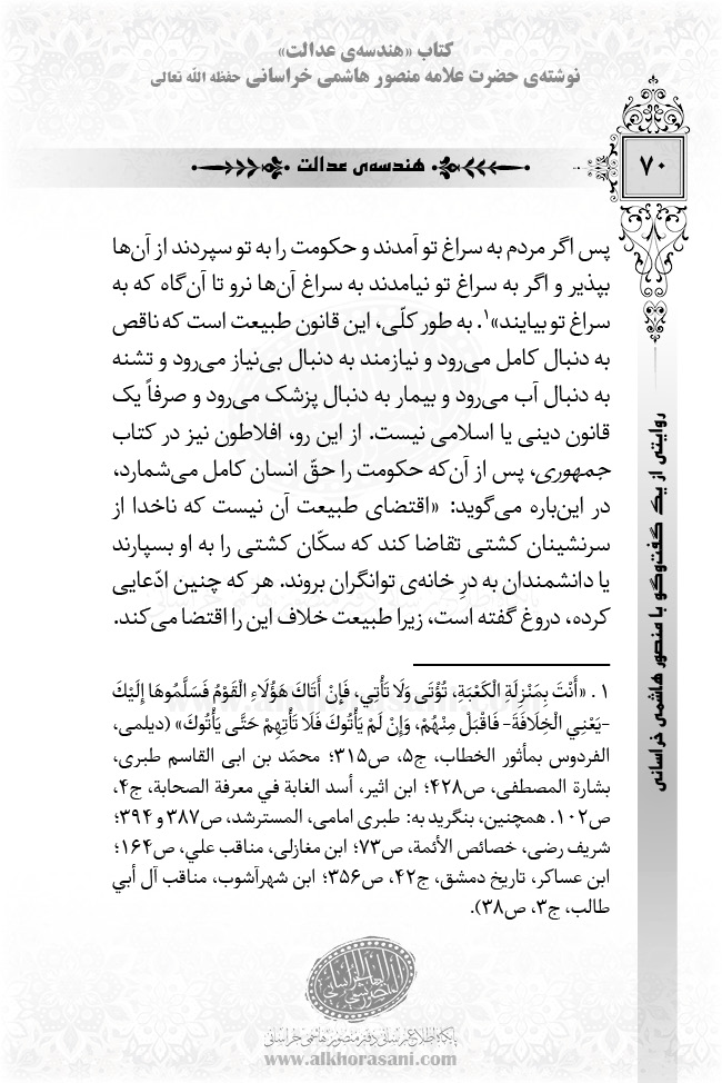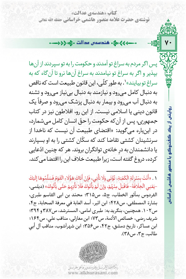 پس اگر مردم به سراغ تو آمدند و حکومت را به تو سپردند از آن‌ها بپذیر و اگر به سراغ تو نیامدند به سراغ آن‌ها نرو تا آن‌گاه که به سراغ تو بیایند»[۱]. به طور کلّی، این قانون طبیعت است که ناقص به دنبال کامل می‌رود و نیازمند به دنبال بی‌نیاز می‌رود و تشنه به دنبال آب می‌رود و بیمار به دنبال پزشک می‌رود و صرفاً یک قانون دینی یا اسلامی نیست. از این رو، افلاطون نیز در کتاب جمهوری، پس از آن‌که حکومت را حقّ انسان کامل می‌شمارد، در این‌باره می‌گوید: «اقتضای طبیعت آن نیست که ناخدا از سرنشینان کشتی تقاضا کند که سکّان کشتی را به او بسپارند یا دانشمندان به درِ خانه‌ی توانگران بروند. هر که چنین ادّعایی کرده، دروغ گفته است، زیرا طبیعت خلاف این را اقتضا می‌کند.