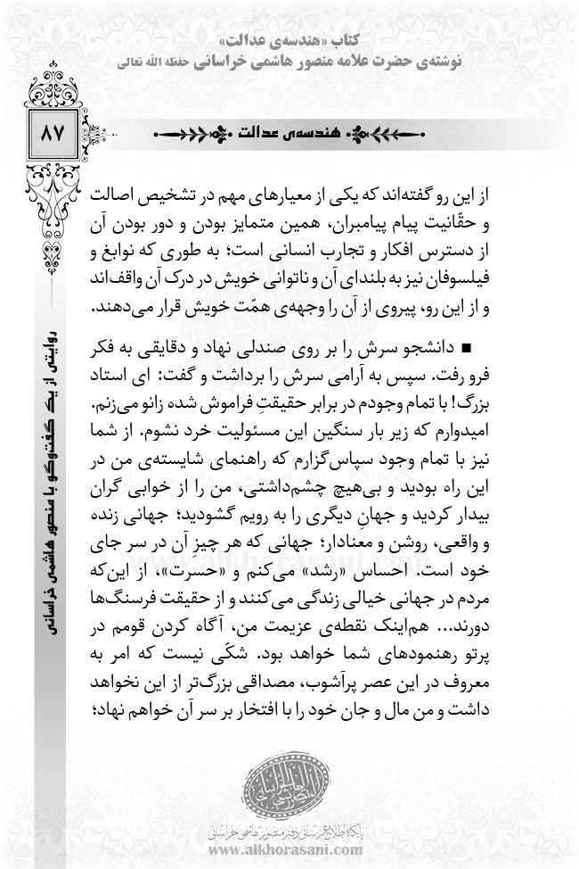 پرسش جدید: شخصی دست دختر بچه‌ی بازیگوشی که به امانت به او سپرده شده بود و النگویی در دست داشت را محکم گرفت تا به این طرف و آن طرف ندود، اما بعداً متوجّه شد که جای النگوی دخترک با فشار دست او قرمز شده و اکنون می‌خواهد بداند که آیا دیه‌ای بر گردن اوست؟ برای مطالعه و دریافت پاسخ، اینجا را کلیک کنید. درس جدید: درس‌هایی از آن جناب درباره‌ی اینکه زمین از مردی عالم به همه‌ی دین که خداوند او را در آن خلیفه، امام و راهنمایی به امر خود قرار داده باشد، خالی نمی‌ماند؛ آیاتی از قرآن در این باره؛ آیه‌ی ۱۹. برای مطالعه‌ی آن، اینجا را کلیک کنید. گفتار جدید: چهار گفتار از آن جناب در بیان اینکه علم حروف و حساب جمّل، اعتباری ندارد، بلکه کهانت محسوب می‌شود. برای مطالعه و دریافت آن، اینجا را کلیک کنید. نکته‌ی جدید: شعر «افتاده یوغ ستم بر گردن جهان...» سروده‌ی «مهدی رضوی» منتشر شد. برای مطالعه و دریافت آن، اینجا را کلیک کنید. برای مطالعه‌ی مهم‌ترین مطالب پایگاه، به صفحه‌ی اصلی مراجعه کنید. نقد جدید: حضرت علامه در نامه‌ی شماره‌ی ۶ فرموده‌اند: «هر چیزی غیر خدا که شما را به خود مشغول کند، شیطان است». می‌خواستم منظور ایشان از این جمله را بدانم. مثلاً اگر درگیر شغلی بودیم برای امرار معاش خود و خانواده باز هم شیطان است؟ برای مطالعه و دریافت بررسی، اینجا را کلیک کنید. فیلم جدید: فیلم جدیدی با موضوع «تقلید و اجتهاد (۱)» منتشر شد. برای مشاهده و دریافت آن، اینجا را کلیک کنید. کتاب جدید: نسخه‌ی سوم کتاب ارزشمند «سبل السّلام؛ مجموعه‌ی نامه‌ها و گفتارهای فارسی حضرت علامه منصور هاشمی خراسانی حفظه الله تعالی» منتشر شد. برای مطالعه و دریافت آن، اینجا را کلیک کنید. نامه‌ی جدید: فرازی از نامه‌ی آن جناب که در آن درباره‌ی شدّت گرفتن بلا هشدار می‌دهد و علّت آن و راه جلوگیری از آن را تبیین می‌کند. برای مطالعه و دریافت آن، اینجا را کلیک کنید. برای مطالعه‌ی مهم‌ترین مطالب پایگاه، به صفحه‌ی اصلی مراجعه کنید.
