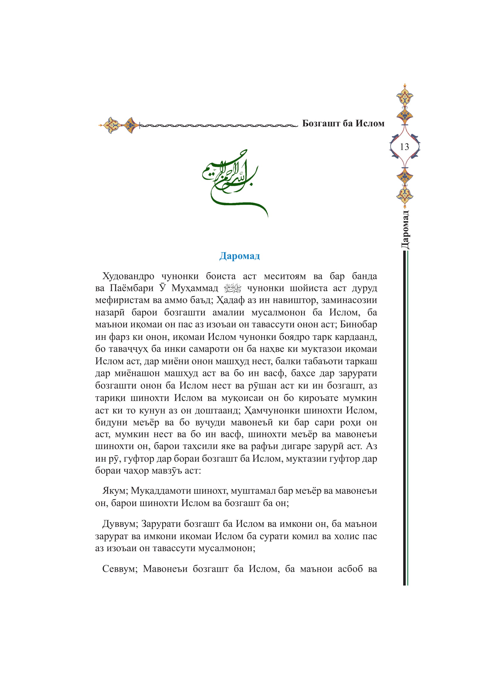 Худовандро чунонки боиста аст меситоям ва бар банда ва Паёмбари Ӯ Муҳаммад чунонки шойиста аст дуруд мефиристам ва аммо баъд; Ҳадаф аз ин навиштор, заминасозии назарӣ барои бозгашти амалии мусалмонон ба Ислом, ба маънои иқомаи он пас аз изоъаи он тавассути онон аст; Бино бар ин фарз ки онон, иқомаи Ислом чунонки боядро тарк кардаанд, бо таваҷҷуҳ ба инки самароти он ба наҳве ки муқтазои иқомаи Ислом аст, дар миёни онон машҳуд нест, балки табаъоти таркаш дар миёнашон машҳуд аст ва бо ин васф, баҳсе дар зарурати бозгашти онон ба Ислом нест ва рӯшан аст ки ин бозгашт, аз тариқи шинохти Ислом ва муқоисаи он бо қироъате мумкин аст ки то кунун аз он доштаанд; Ҳамчунонки шинохти Ислом, бидуни меъёр ва бо вуҷуди мавонеъӣ ки бар сари роҳи он аст, мумкин нест ва бо ин васф, шинохти меъёр ва мавонеъи шинохти он, барои таҳсили яке ва рафъи дигаре зарурӣ аст. Аз ин рӯ, гуфтор дар бораи бозгашт ба Ислом, муқтазии гуфтор дар бораи чаҳор мавзӯъ аст: