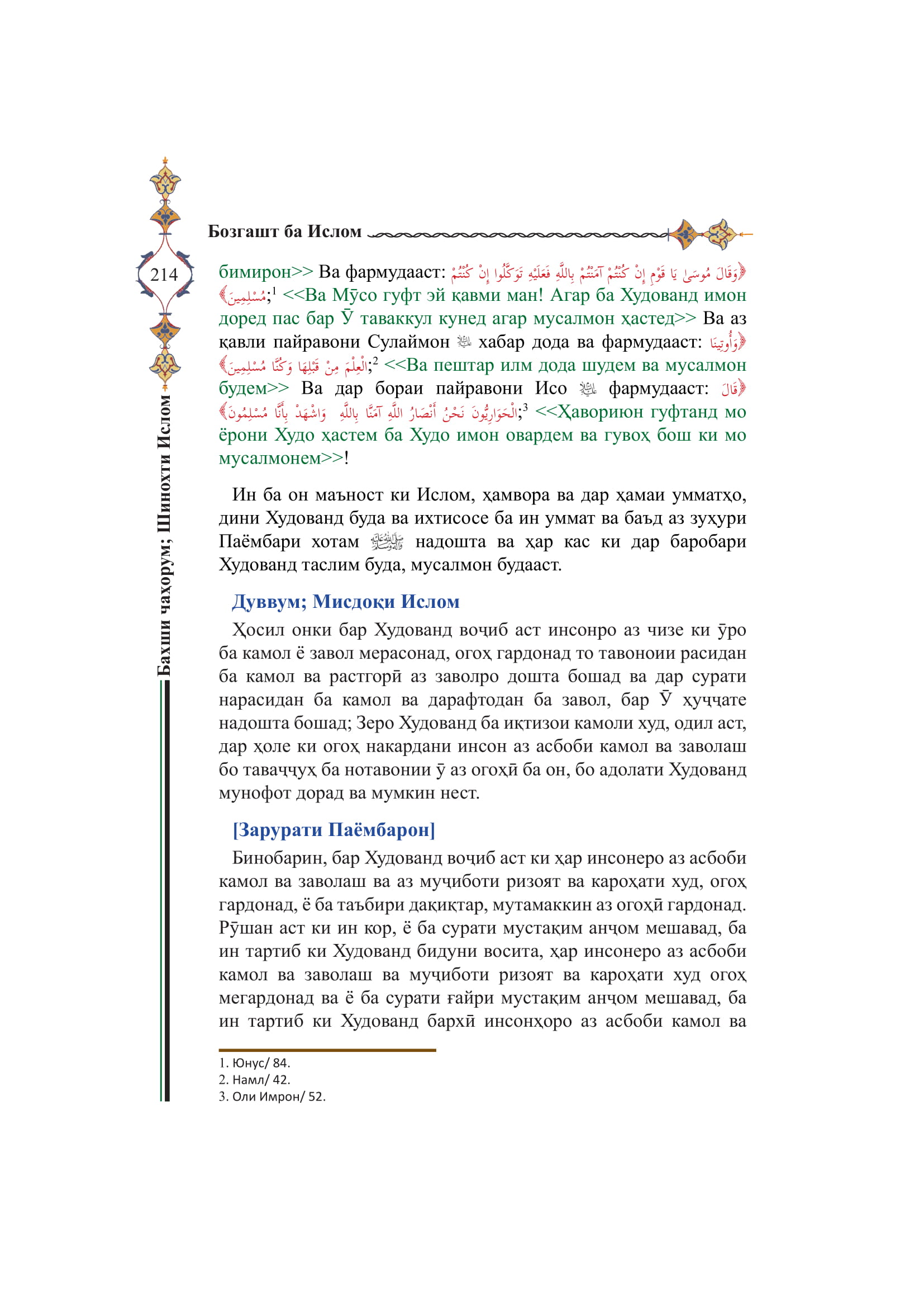 бимирон» Ва фармудааст: ﴿وَقَالَ مُوسَىٰ يَا قَوْمِ إِنْ كُنْتُمْ آمَنْتُمْ بِاللَّهِ فَعَلَيْهِ تَوَكَّلُوا إِنْ كُنْتُمْ مُسْلِمِينَ﴾[1]; «Ва Мӯсо гуфт эй қавми ман! Агар ба Худованд имон доред пас бар Ӯ таваккул кунед агар мусалмон ҳастед» Ва аз қавли пайравони Сулаймон хабар дода ва фармудааст: ﴿وَأُوتِينَا الْعِلْمَ مِنْ قَبْلِهَا وَكُنَّا مُسْلِمِينَ﴾[2]; «Ва пештар илм дода шудем ва мусалмон будем» Ва дар бораи пайравони Исо фармудааст: ﴿قَالَ الْحَوَارِيُّونَ نَحْنُ أَنْصَارُ اللَّهِ آمَنَّا بِاللَّهِ وَاشْهَدْ بِأَنَّا مُسْلِمُونَ﴾[3]; «Ҳавориюн гуфтанд мо ёрони Худо ҳастем ба Худо имон овардем ва гувоҳ бош ки мо мусалмонем»!