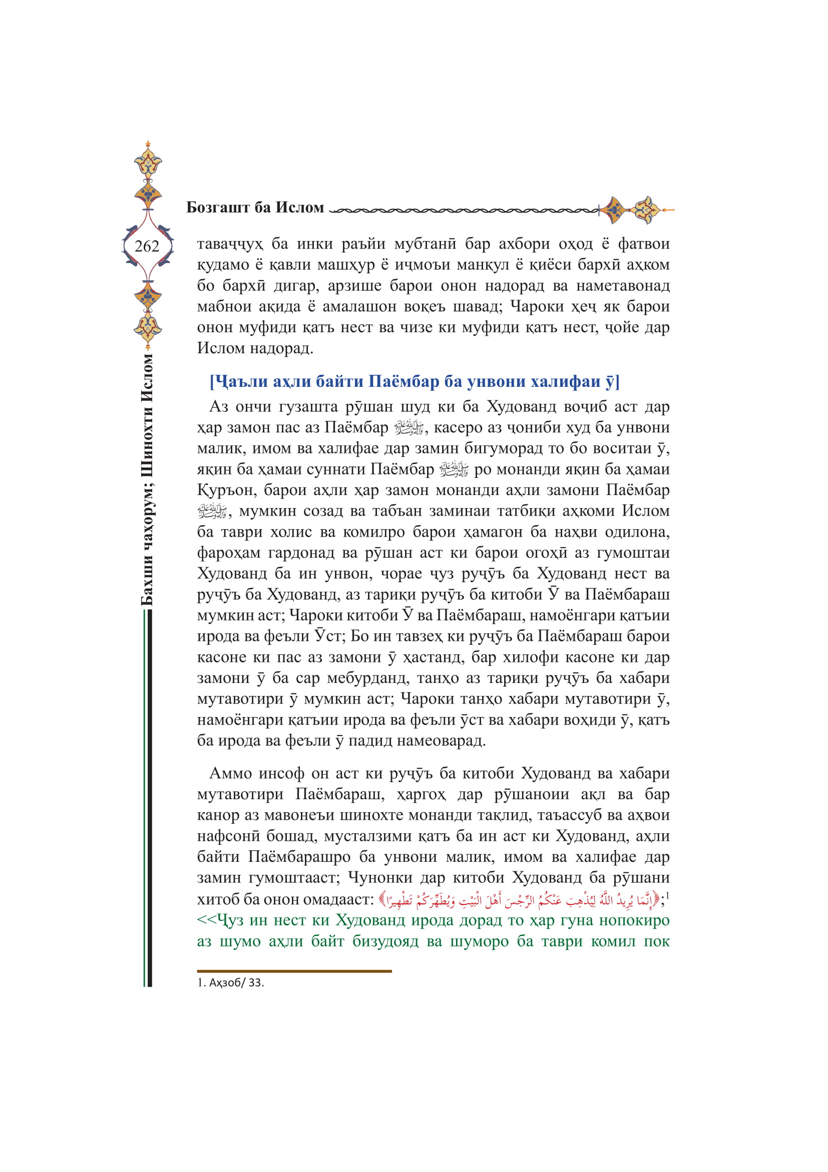 Аммо инсоф он аст ки руҷӯъ ба китоби Худованд ва хабари мутавотири Паёмбараш, ҳаргоҳ дар рӯшаноии ақл ва бар канор аз мавонеъи шинохте монанди тақлид, таъассуб ва аҳвои нафсонӣ бошад, мусталзими қатъ ба ин аст ки Худованд, аҳли байти Паёмбарашро ба унвони малик, имом ва халифае дар замин гумоштааст; Чунонки дар китоби Худованд ба рӯшани хитоб ба онон омадааст: ﴿إِنَّمَا يُرِيدُ اللَّهُ لِيُذْهِبَ عَنْكُمُ الرِّجْسَ أَهْلَ الْبَيْتِ وَيُطَهِّرَكُمْ تَطْهِيرًا﴾[1]; «Ҷуз ин нест ки Худованд ирода дорад то ҳар гуна нопокиро аз шумо аҳли байт бизудояд ва шуморо ба таври комил пок