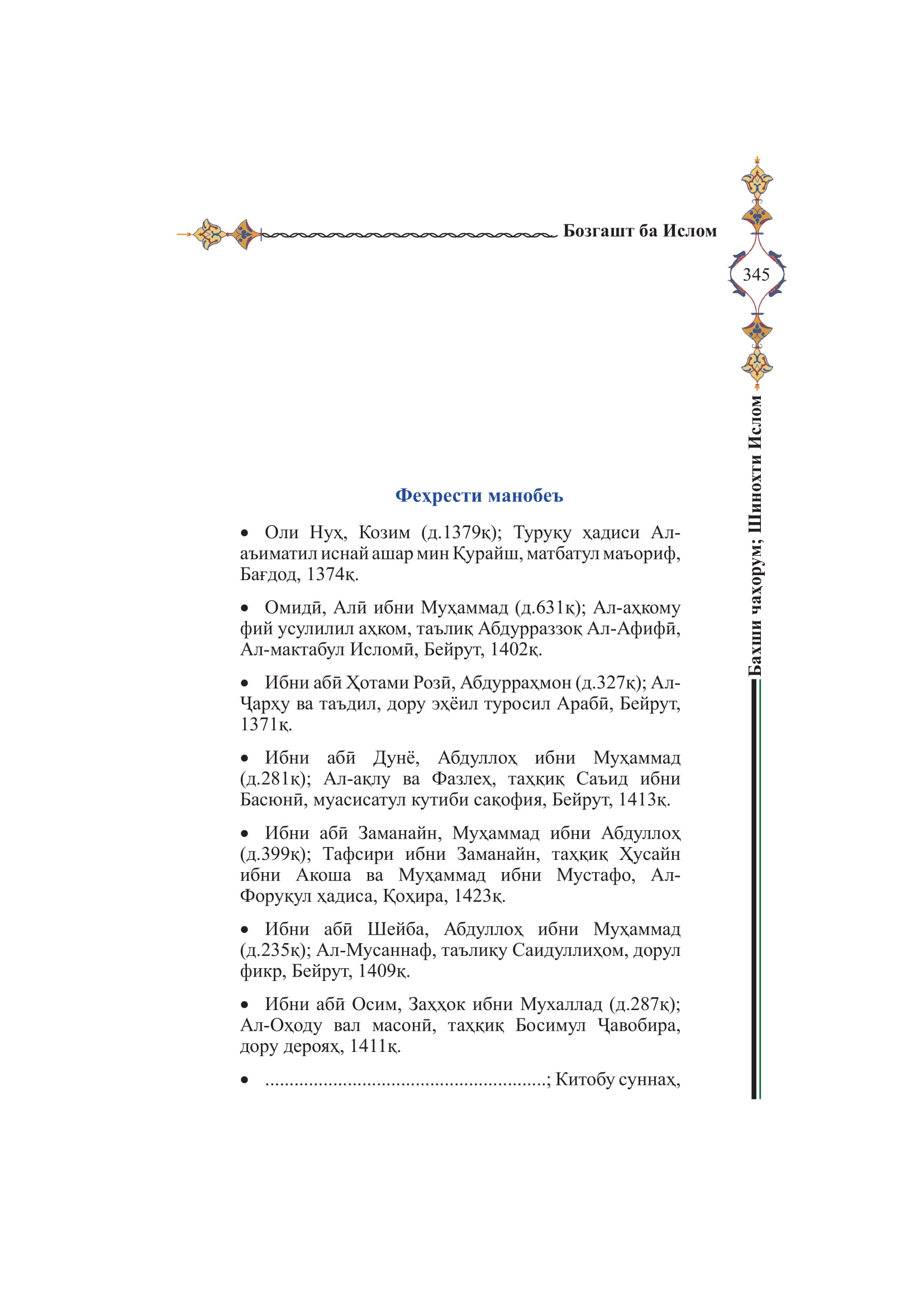 3 .Ибни абӣ Ҳотами Розӣ, Абдурраҳмон ибни Муҳаммад ибни Идрис (д.327қ); Ал-Ҷарҳу вал Таъдил, Дору Эҳёил Туросил Арабӣ, Бейрут, 1371қ.