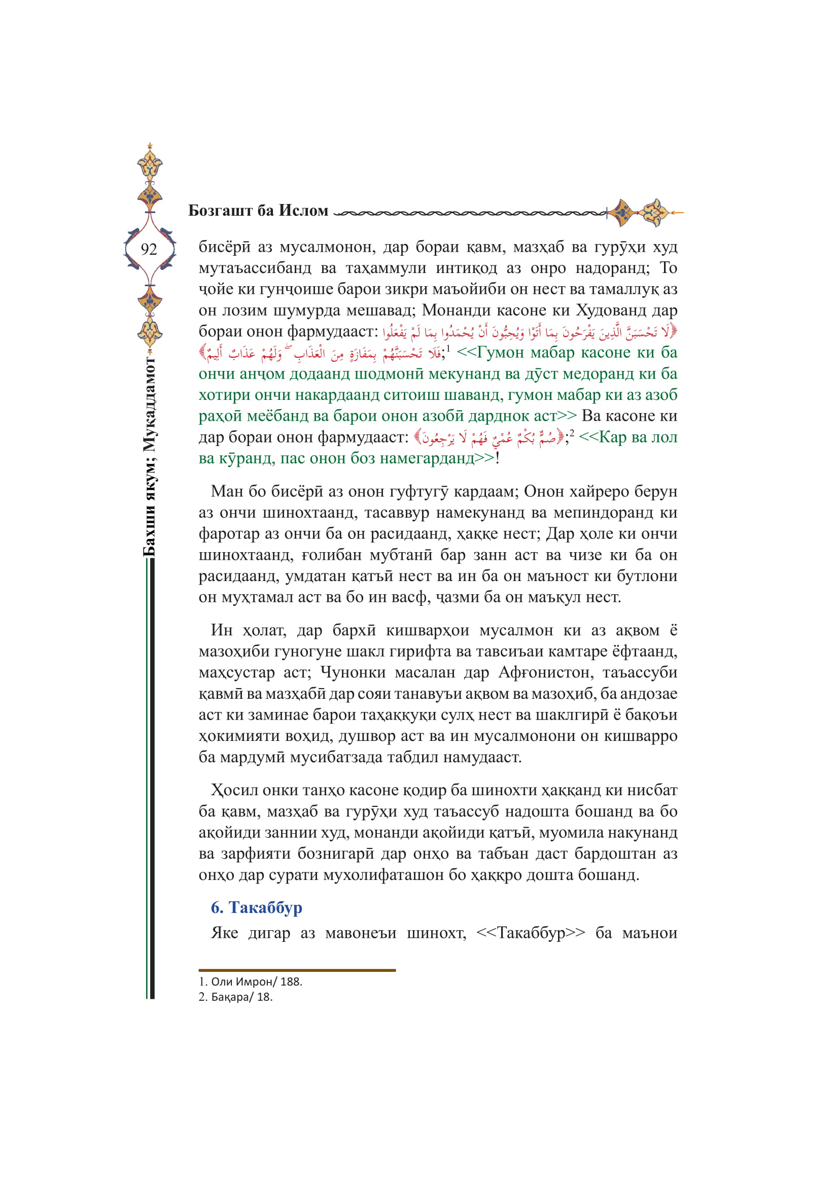 бисёрӣ аз мусалмонон, дар бораи қавм, мазҳаб ва гурӯҳи худ мутаъассибанд ва таҳаммули интиқод аз онро надоранд; То ҷойе ки гунҷоише барои зикри маъойиби он нест ва тамаллуқ аз он лозим шумурда мешавад; Монанди касоне ки Худованд дар бораи онон фармудааст: ﴿لَا تَحْسَبَنَّ الَّذِينَ يَفْرَحُونَ بِمَا أَتَوْا وَيُحِبُّونَ أَنْ يُحْمَدُوا بِمَا لَمْ يَفْعَلُوا فَلَا تَحْسَبَنَّهُمْ بِمَفَازَةٍ مِنَ الْعَذَابِ ۖ وَلَهُمْ عَذَابٌ أَلِيمٌ﴾[1]; «Гумон мабар касоне ки ба ончи анҷом додаанд шодмонӣ мекунанд ва дӯст медоранд ки ба хотири ончи накардаанд ситоиш шаванд, гумон мабар ки аз азоб раҳоӣ меёбанд ва барои онон азобӣ дарднок аст» Ва касоне ки дар бораи онон фармудааст: ﴿صُمٌّ بُكْمٌ عُمْيٌ فَهُمْ لَا يَرْجِعُونَ﴾[2]; «Кар ва лол ва кӯранд, пас онон боз намегарданд»!